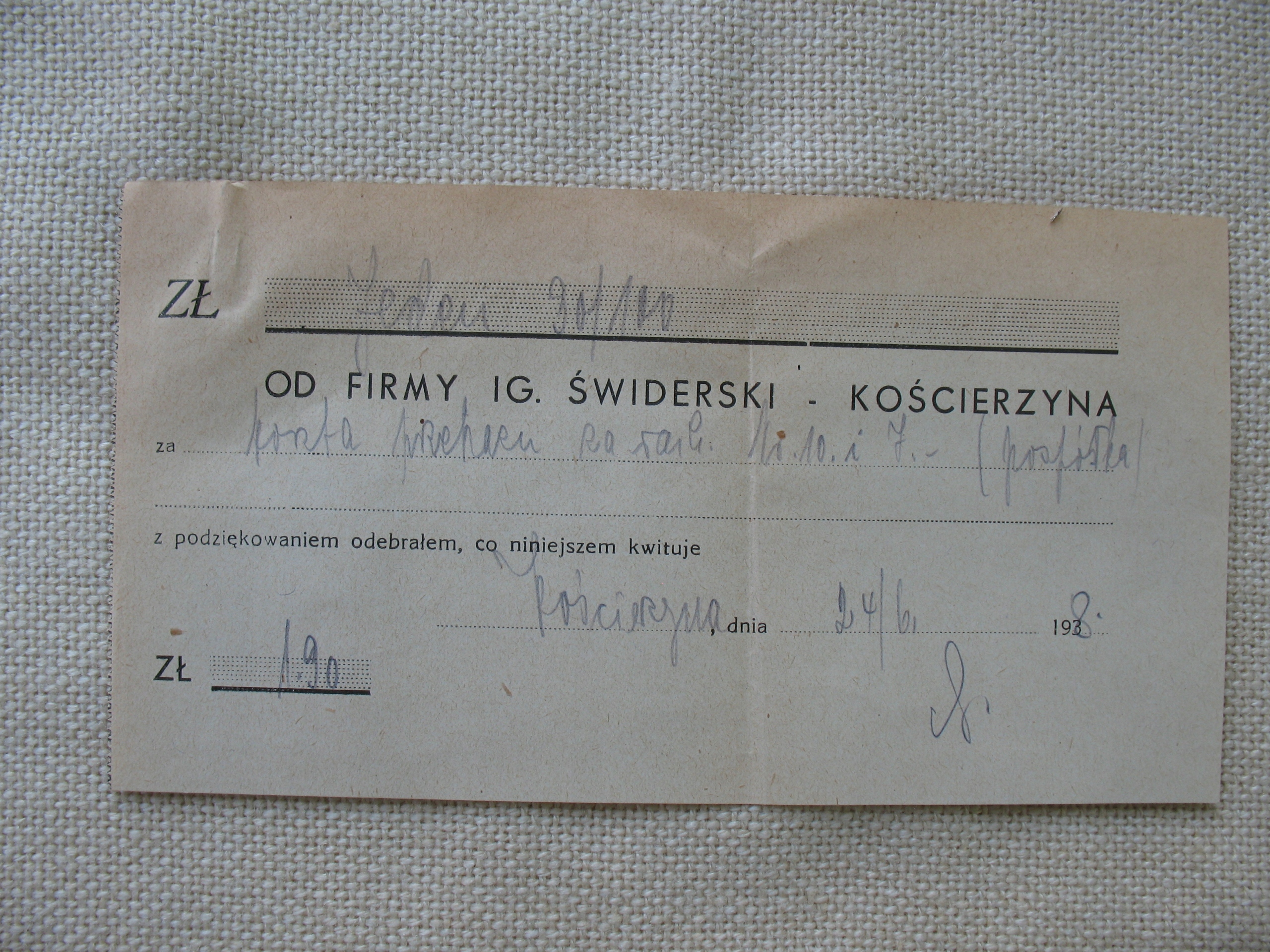 Старий, оригінальний, довоєнний документ: квитанція компанії «Іг». Свідерського в Костежині. Оригінал. Дата: 1938 р. Розміри: 100 х 190 мм. Стан: на мій погляд хороший, сліди складання на дві частини, перегини, невеликі забруднення, все видно на сканах. Не соромтеся робити покупки.