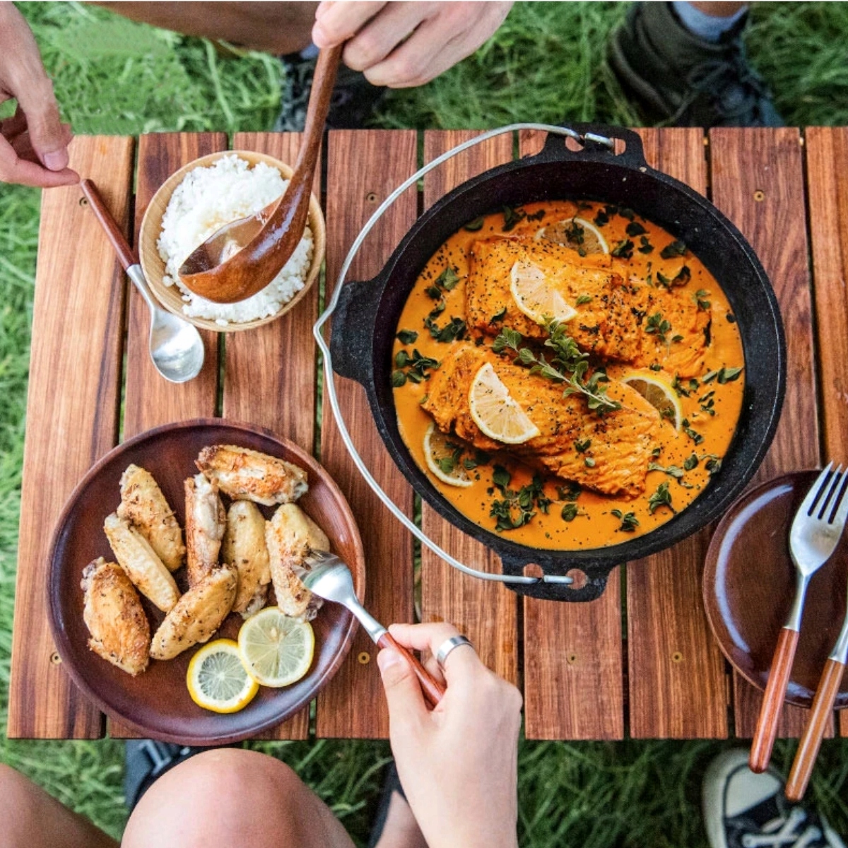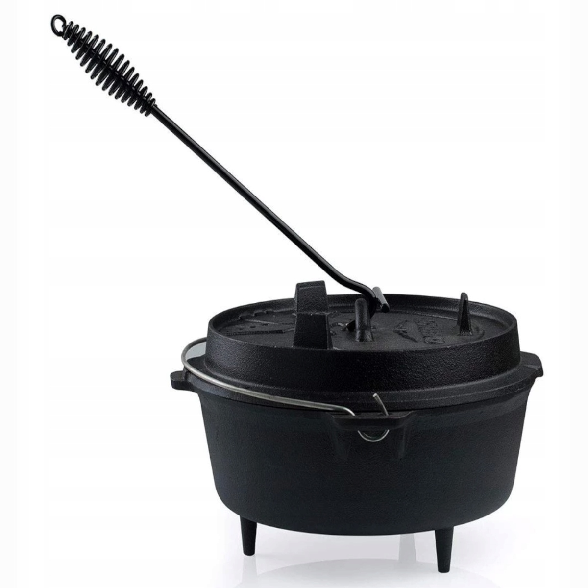 Чавунний казан - ідеальне рішення для вечірок на природі. Він має ємність 6 л і може бути встановлений над вогнем, а кришку каструлі можна використовувати як сковорідку.
