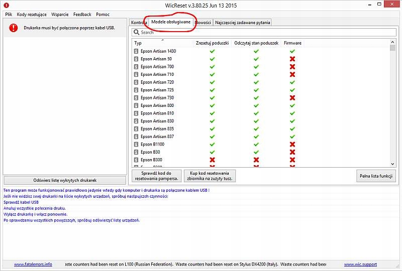 Наведений нижче список сумісності стосується версії програми v.5.00.35. Будь ласка, перевірте поточний список у програмі (опис вище). За замовчуванням програма завантажує оновлення кожного разу під час запуску, тому програма завжди має найновіший список підтримуваних принтерів. Якщо принтера немає в програмі, це означає, що програма його не підтримує (програма скидає лічильники тільки на принтерах, які вказані в програмі, це не всі принтери EPSON і CANON) !!! p>