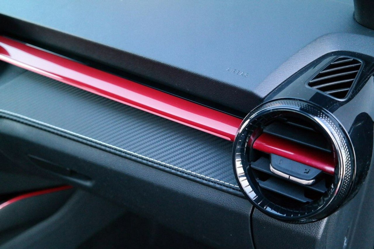 - Спортивні інтер'єрні елементи: крісла з інтегрованими підголівниками, чорним хедлайнер, декор у вуглецевому стилі, декоративна панель приладів, обробка середньої консолі, червоні дверні ручки червоного