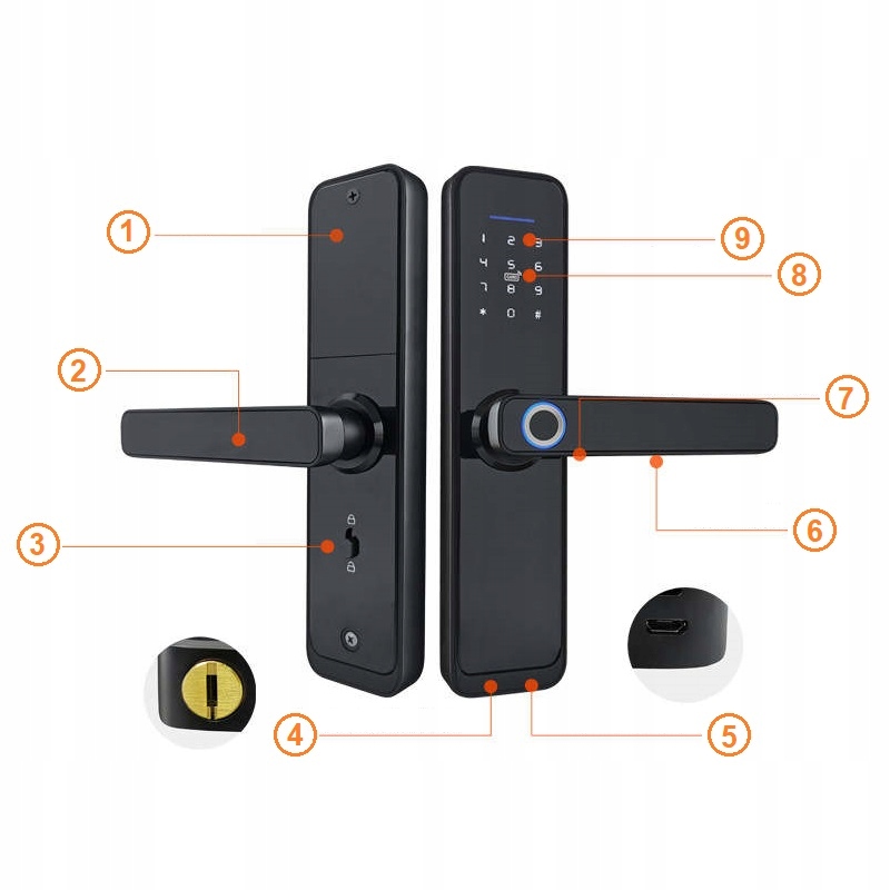 - Електронна дверна ручка відкривається за допомогою картки відбитків пальців/RFID, PIN-коду, тимчасового PIN-коду та стандартного ключа