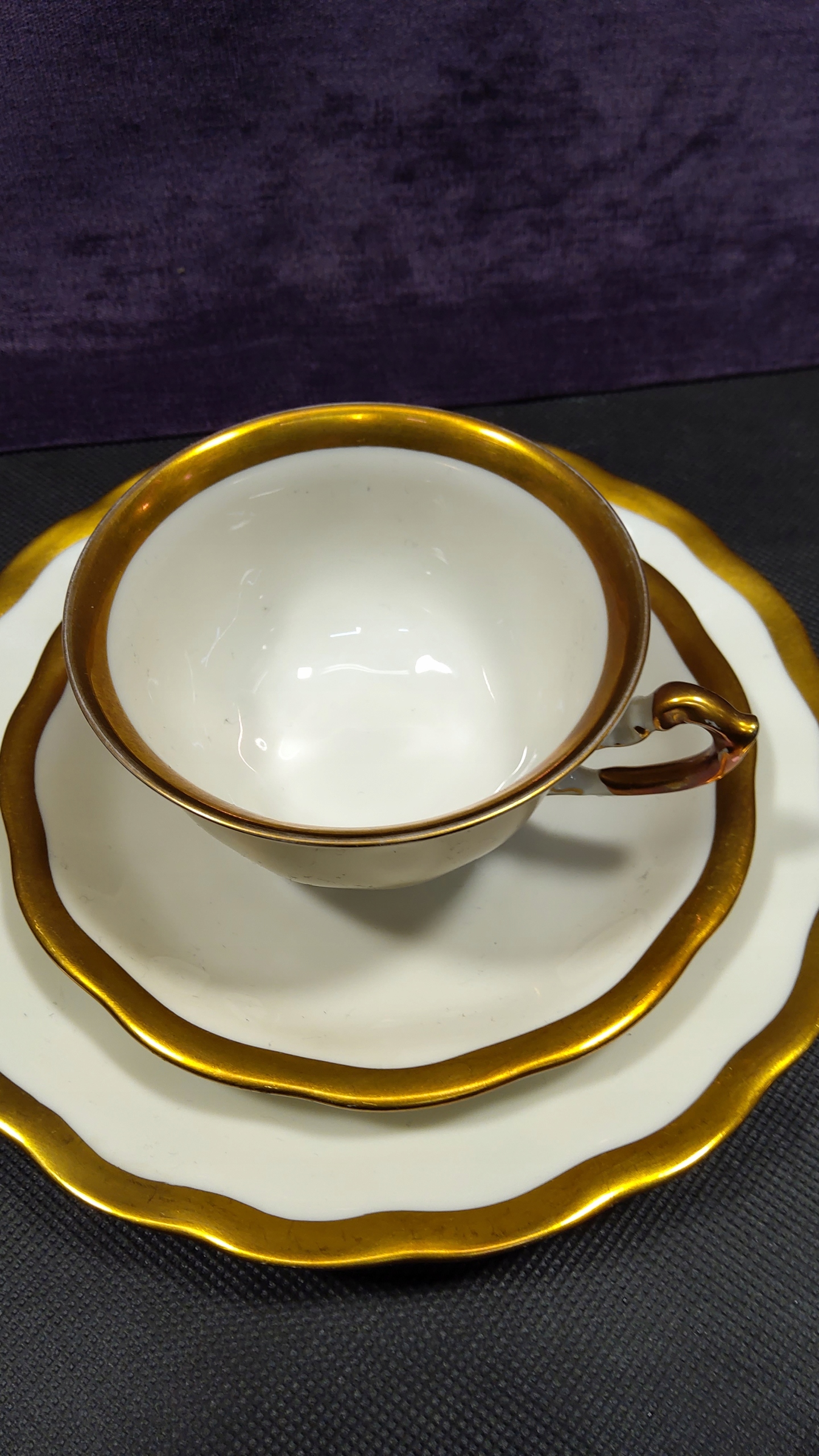 Колекційний набір для сніданку з довоєнної порцелянової фабрики в Явожині Шльонській, Кеніґсзельт. Цінується стиль шарлот, прикрашений товстим позолотою. Порцеляна кольору екрю в дуже хорошому стані, незважаючи на свій вік. Чашка на позолочених ніжках висотою 6 см, діаметр наповнювача 9,5 см, підстави 14,5 см, тарілка десертна діаметром 19,5 см. Рекомендовано.