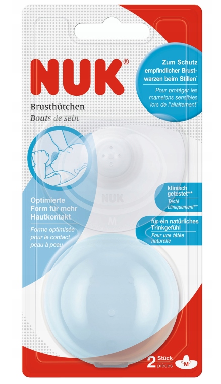 Щитки для сосків NUK мають оптимізовану форму, яка забезпечує кращий контакт шкіри між вами та вашою дитиною. 92% матерів підтверджують, що ніс дитини має достатньо місця при використанні щитка для сосків NUK*. Дитина може відчувати матір і відчувати її запах, а інтенсивний зв’язок, який розвивається під час грудного вигодовування, не порушується. Різні структури поверхні чохла для годування NUK і чотирьох отворів для пиття створені за моделлю грудей матері, забезпечуючи природне і спокійне споживання. Щитки для сосків NUK, виготовлені з тонкого як павутинка силікону, зменшують тиск на чутливі соски під час грудного вигодовування та допомагають дітям, які погано захоплюються, краще захоплюватися грудьми матері.