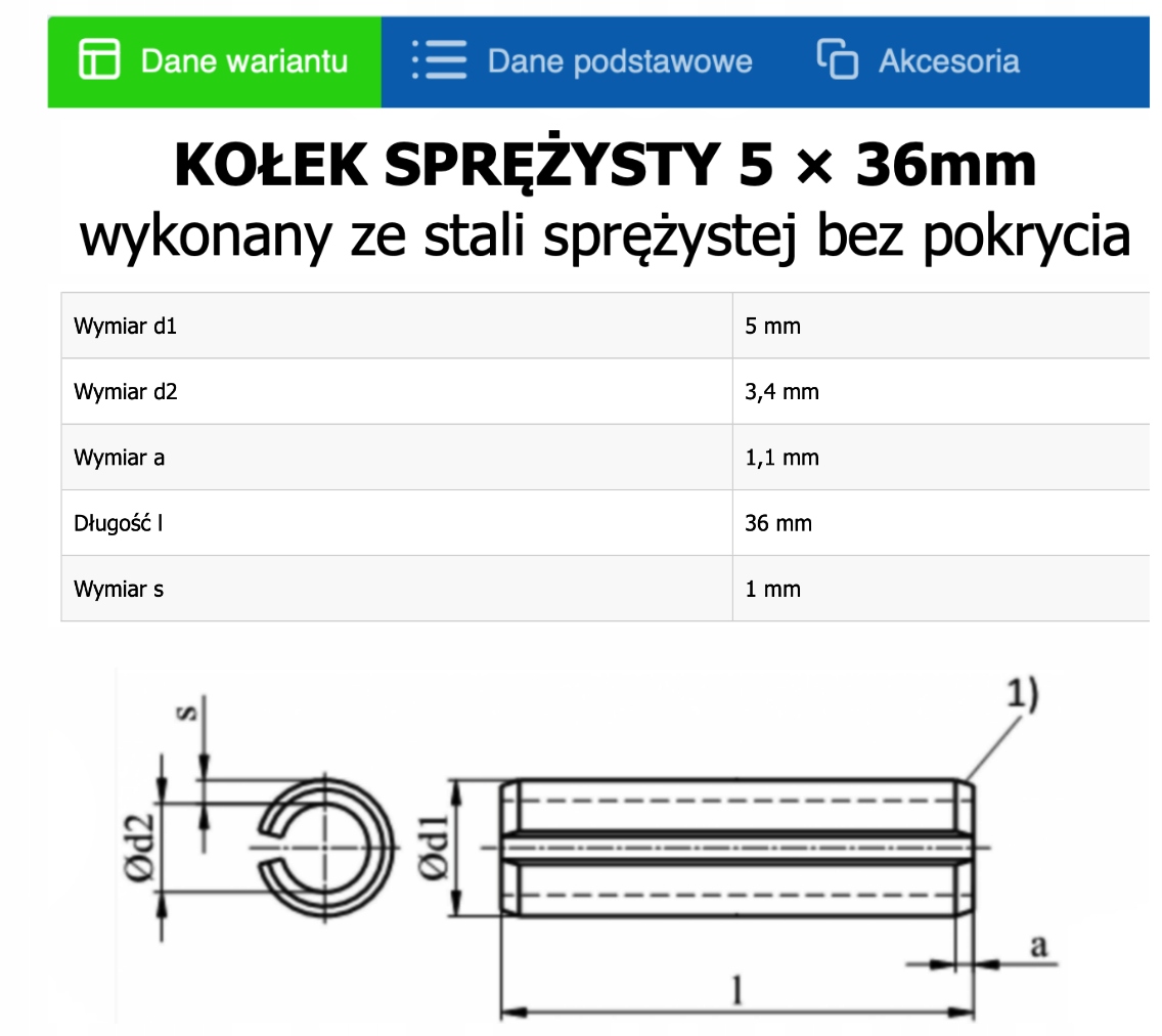 Kołki, Kołek sprężysty wg DIN 1481 stal sprężynowa 5x36mm 100szt
