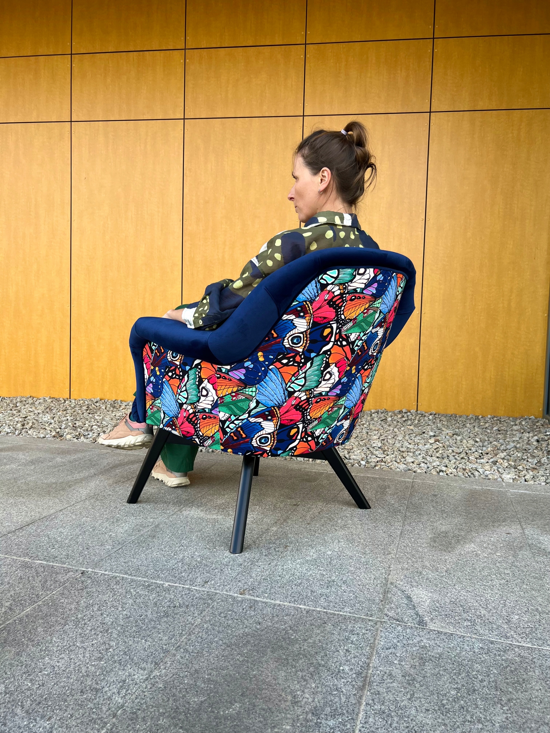 Студія Fotelownia рекомендує до продажу крісло ковшового типу на основі фанерного каркасу на дерев'яній ніжці Х-подібної форми.Злегка нахилена спинка. Крісло можна використовувати як стільчик для годування і ідеально впишеться в інтер'єр вітальні, спальні або громадських місць, наприклад, кафе, бутіка, студії, офісу, салону краси.
