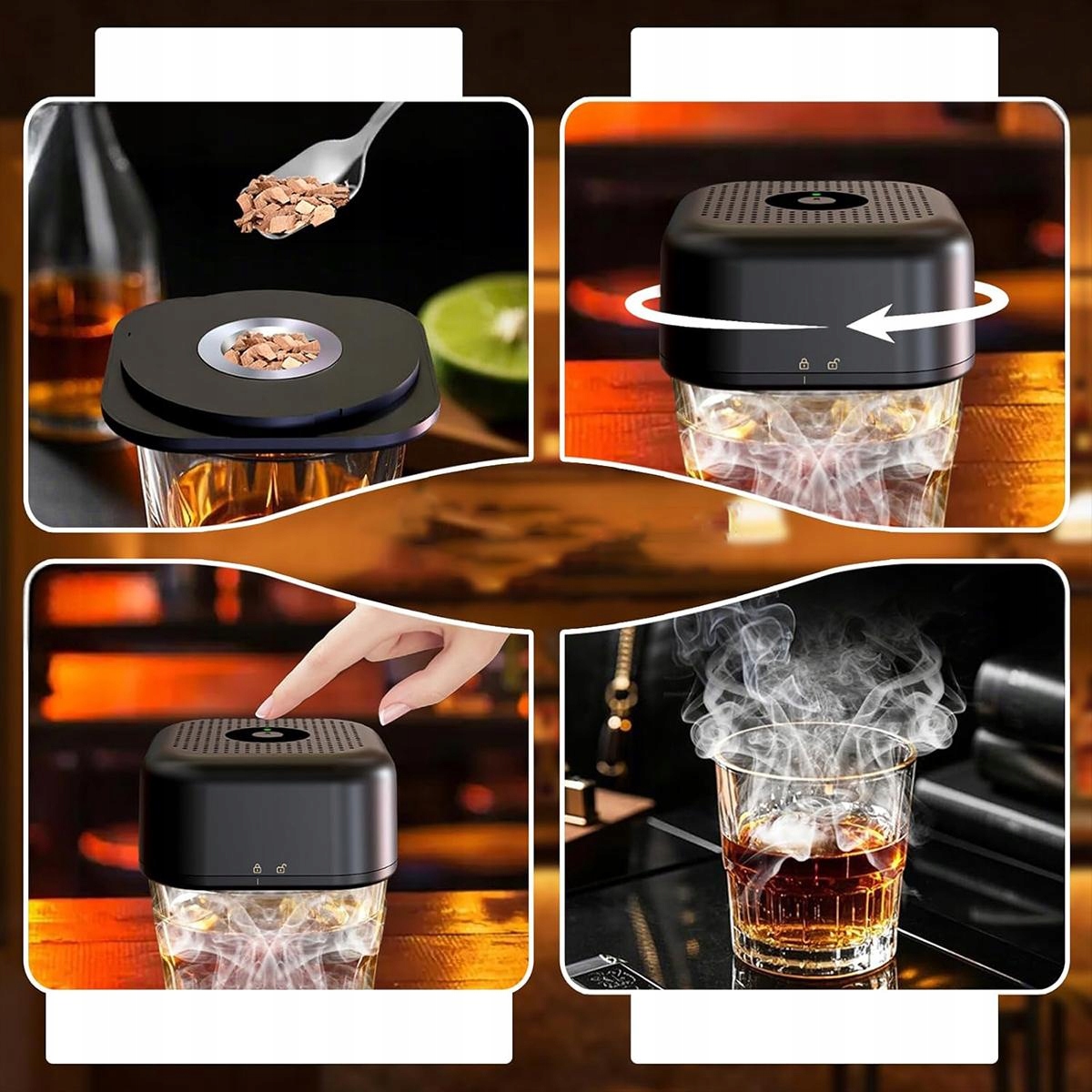 Забезпечує унікальну смакову подорож. Подібно до того, як коктейль-машина готує різноманітні напої, ви можете налаштувати димний смак свого віскі за допомогою різних деревних стружок, таких як яблуко, вишня чи дуб. Це збагачує відчуття смаку, надаючи йому глибини та привабливості. Ідеально підходить для любителів віскі, які шукають чогось нового.