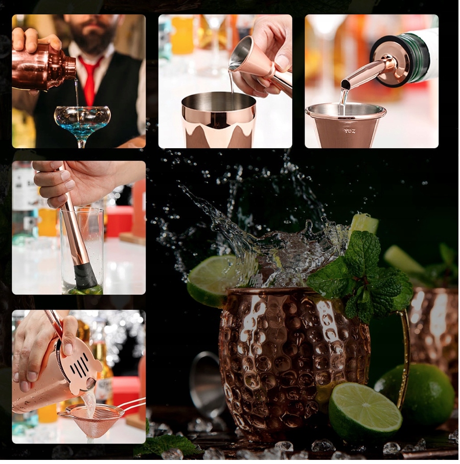 – набір інструментів для змішування коктейлів із 16 предметів, коктейльний шейкер, джиггер, дозатор, штопор, щипці, калачик, ложка, 4 соломинні ложки, 4 фільтри та підставка.