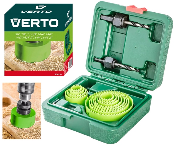 VERTO (арт. № 60H954), складається з двох адаптерів і 12 частин діркових пил розміру від 19 до 76 мм. Зубці зі швидкорізальної сталі дозволяють ефективно свердлити точні отвори в сталі, дереві, пластику, композитах. Пластикова касета дозволяє зручно зберігати набір. Бренд VERTO пропонує асортимент електроінструментів і аксесуарів для кожного ентузіаста DIY.