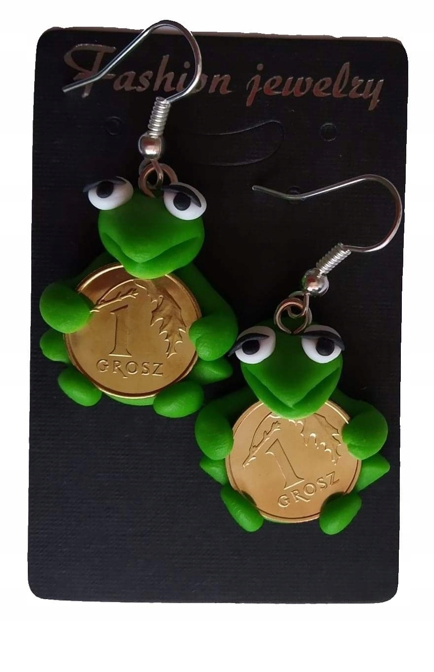 KOLCZYKI Z MODELINY ŻABA Z GROSIKIEM NA SZCZĘŚCIE