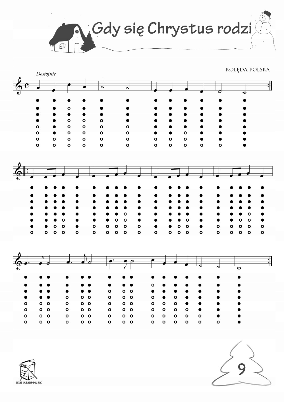 Різдвяні колядки в аранжуванні для блокфлейти з табулатурами та акомпанементами — це збірка сімнадцяти найпопулярніших колядок у легкому аранжуванні для блокфлейти з акомпанементом mp3 (для зручного завантаження). Ноти можуть успішно підтримувати навчання гри на флейті в дитячих садках і школах, а також власне музикування вдома.