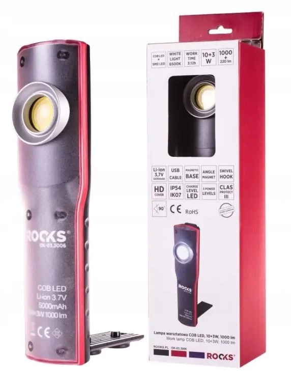 лампа rooks для семінару та інспекційних додатків має компактну універсальну конструкцію з високою стійкістю до ударів, тріщин і падінь (клас IK07). rooks лампа має діоди з качками з 1000 люмен , які світять чистим, чистим світлом з холодним кольором 6500k . Structurally, the lamp is the sister of the lamp OK-03.3005 and Ok-03.3014, has a resistant HD cover cover IK07 class, IP54 water resistance, powerful battery 3.7V 5000 mAh , light intensity 1000 + 200 lum, hang hook, adjustable foot with strong magnets, system informing about charging, loading With the help of a cable or charging base, which is included, while charging supply is Зроблено із зовнішнього USB -зарядного пристрою.