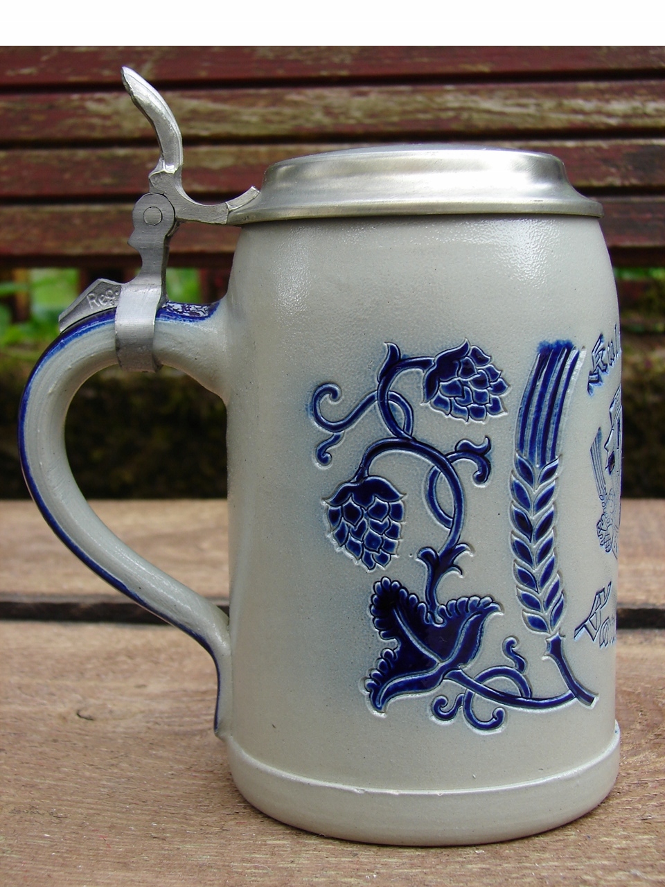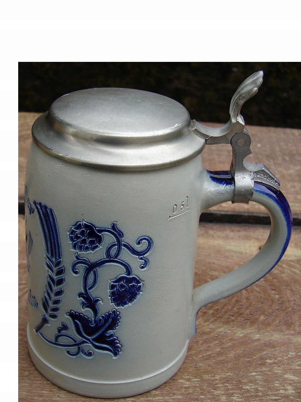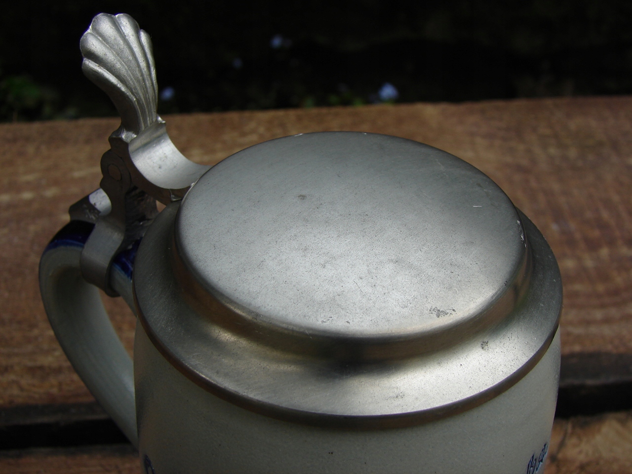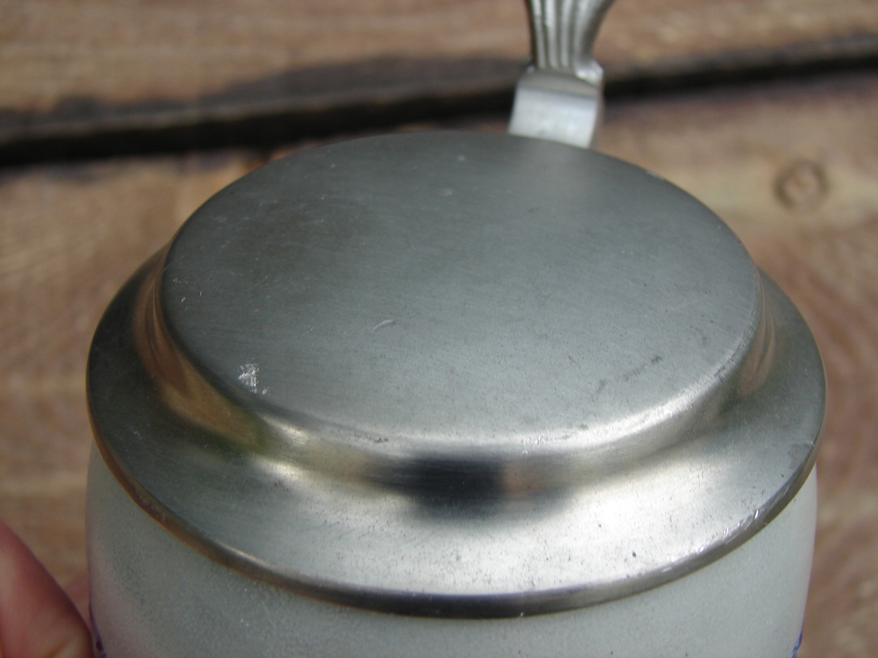 Кухоль без тріщин, добре збережена жерстяна кришка має патинований наліт і місцевий подряпини.