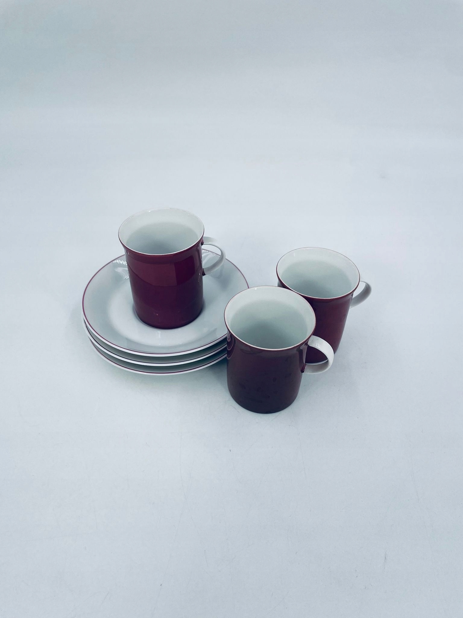 Колекційна чашка в дуеті від відомого бренду Rosenthal. Набір виготовлений з високоякісної білої порцеляни. Чашка бордового кольору, тарілка біла з бордовим покриттям по краю.