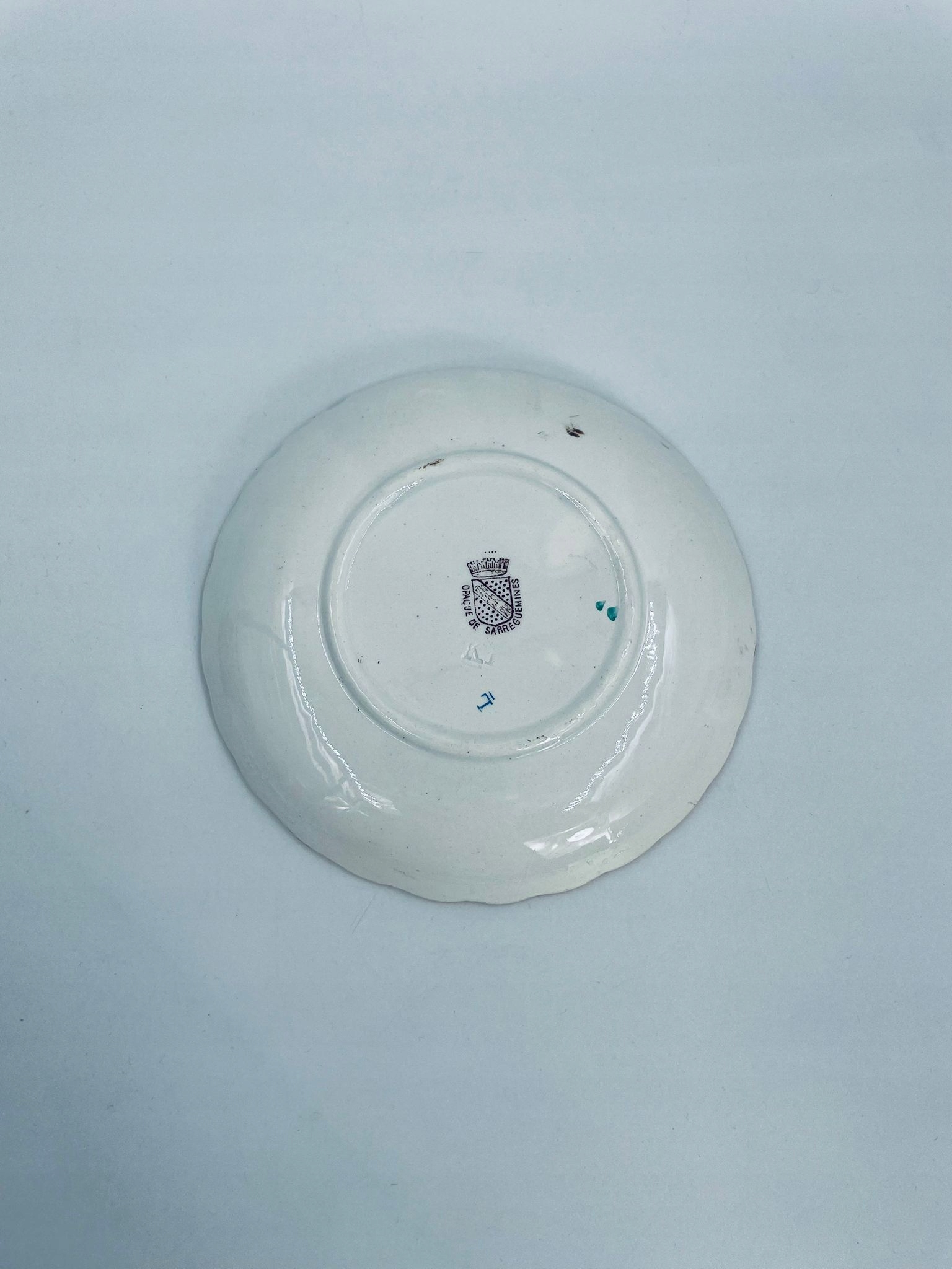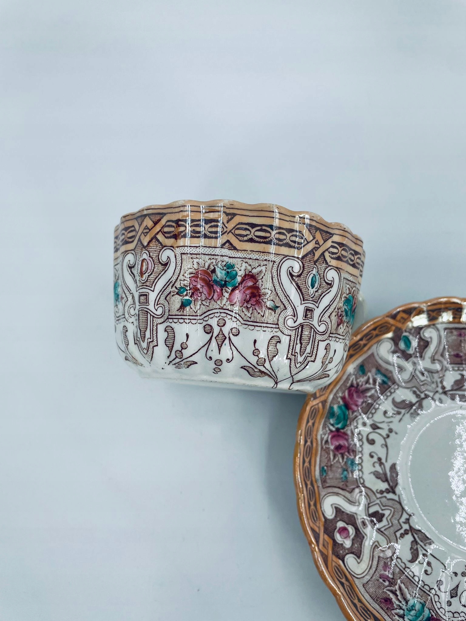 Колекційна чашка в дуеті, антикварна, французької фабрики Opaque de Sarreguemines, яка була заснована в 1790 році, виготовлена з фаянсу. Набір має насичений різнокольоровий візерунок, розписаний вручну, який включає як геометричні, так і квіткові мотиви, а також хвилястий край, який надає елегантного вигляду. Має потертості.