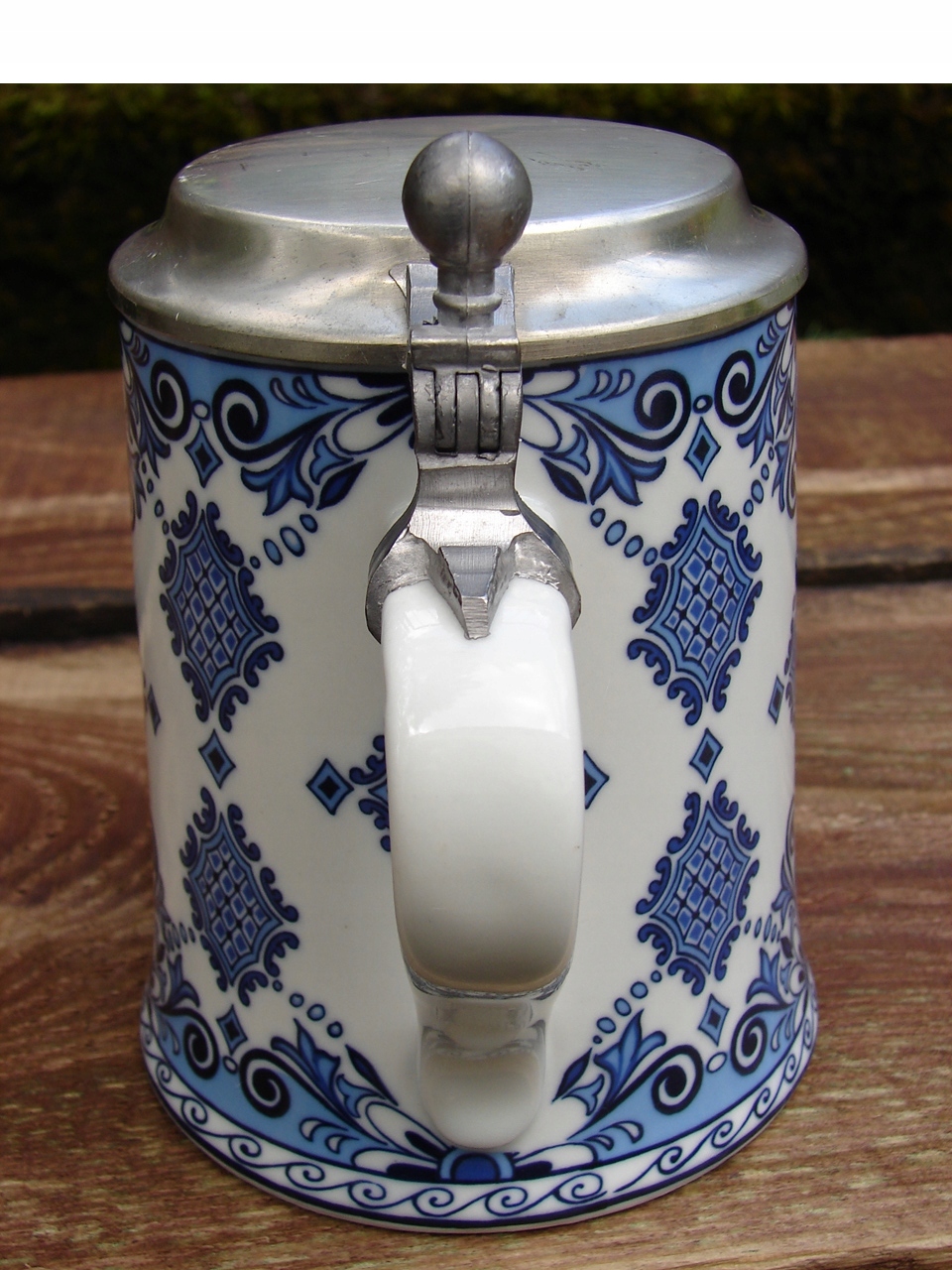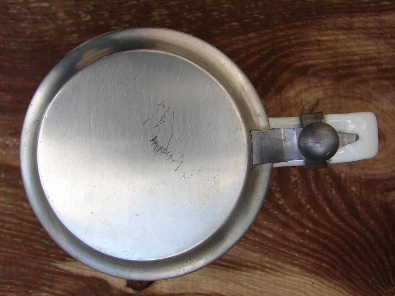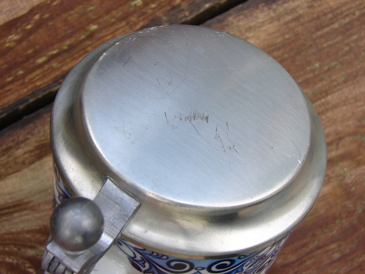 Кухоль без тріщин, гарно збережена жерстяна кришка, має наліт патини та локальні подряпини.