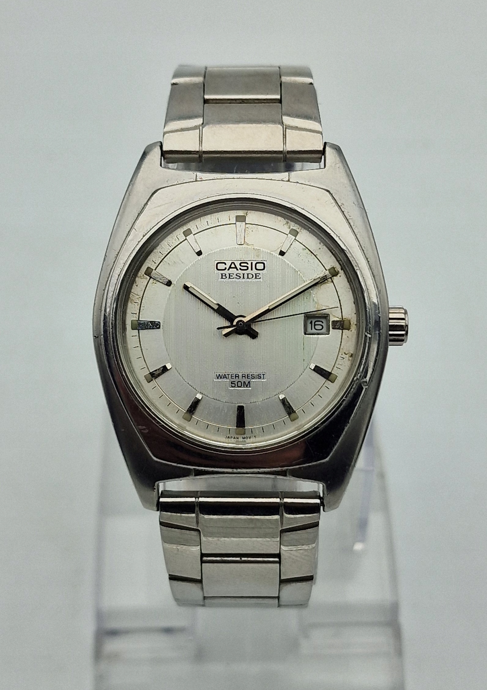 - Чорний циферблат зі срібними годинниковими мітками та відображенням дати. Циферблат підписаний: «CASIO BESIDE WATER RESIST 50M, JAPAN MOVT». Циферблат майже в ідеальному стані, як показано на фотографіях з аукціону.