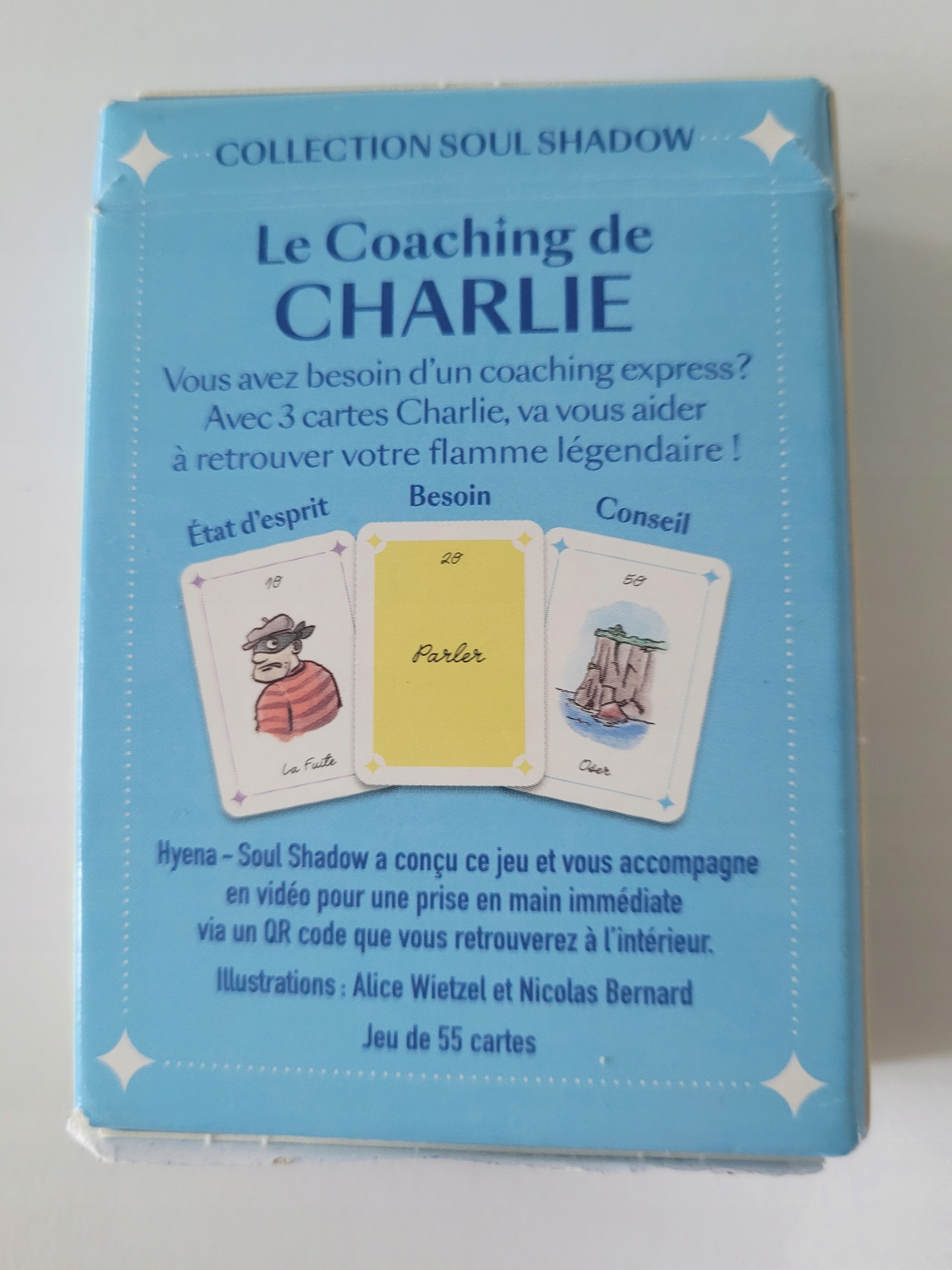 "Привіт, я Чарлі, твій особистий супутник, а також твій найкращий друг і довірена особа". Я супроводжуватиму вас у вашій особистій подорожі освіжаючим і завжди практичним способом. Чарлі з 3 картками представляє персонального тренера, який показує ваш стан розуму, свідомі та несвідомі потреби, а також картку-порадник, яка допоможе вам рухатися вперед. Набір із 55 карт у покерному форматі та компактній упаковці, які зручно брати з собою будь-куди, щоб грати вдома чи зустрічатися з друзями. Виявлення та використання Intercessor відео та робочих аркушів, що підсумовують значення карток, дають вам негайне розуміння. Гієна, ворожка з YouTube-каналу Soul Shadow, розробила колекцію інструментів для ворожіння, доступну кожному: особливо початківцям і експертам. Ця колекція була задумана як гурт друзів; кожна гра має власну назву, власну систему ворожіння та тип поради, яку дав би друг відповідно до його чи її особистості. Ці оракули мають однаковий відтінок кольорів, тому ви можете змішувати їх і збагачувати свої відбитки графічною послідовністю.
