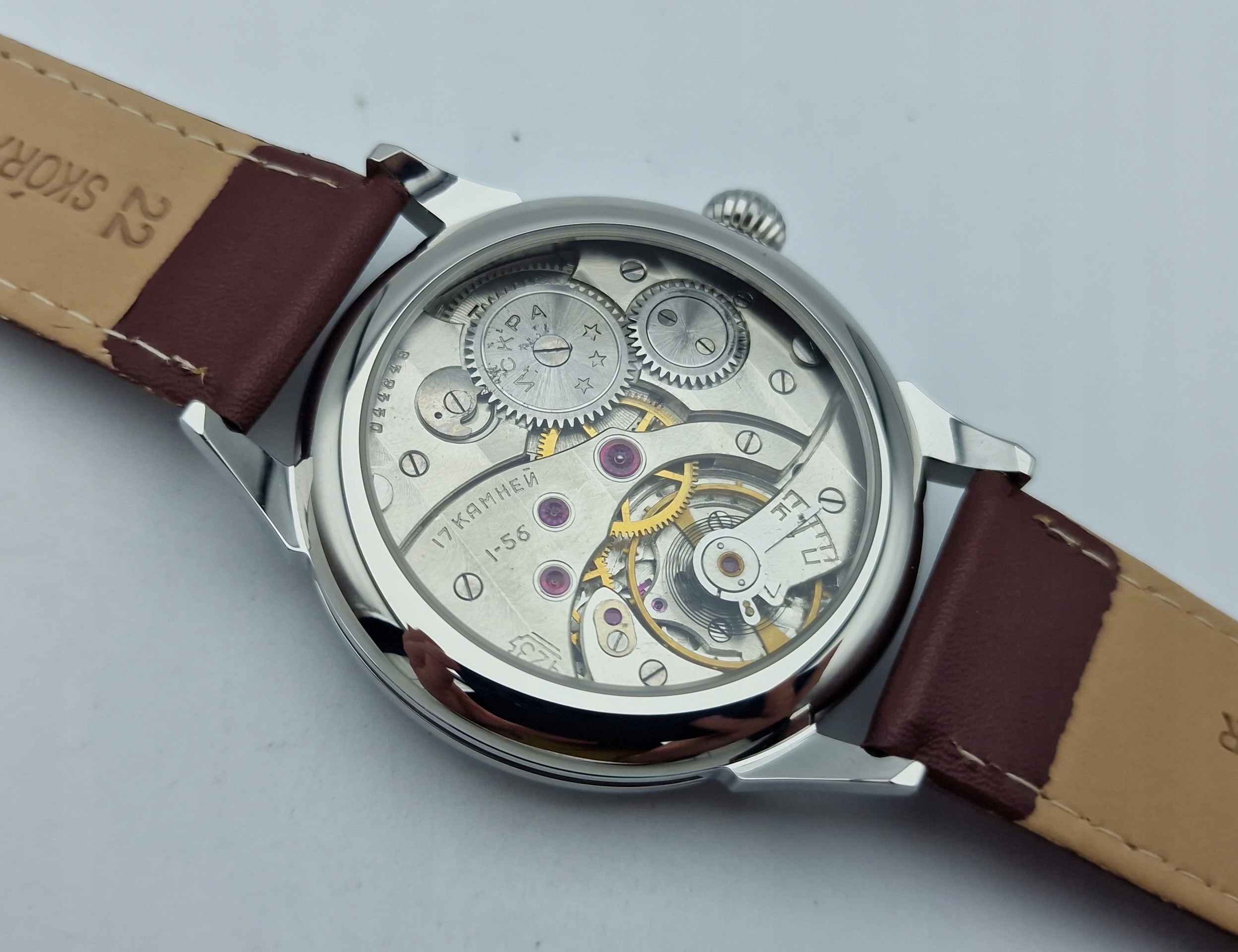 - Годинниковий механізм з 17 камінням, з якірним спуском, з підписами: «17 КАМЕНІВ, 1-56». Механізм працює добре та є точним після перевірки та обслуговування годинникарем.