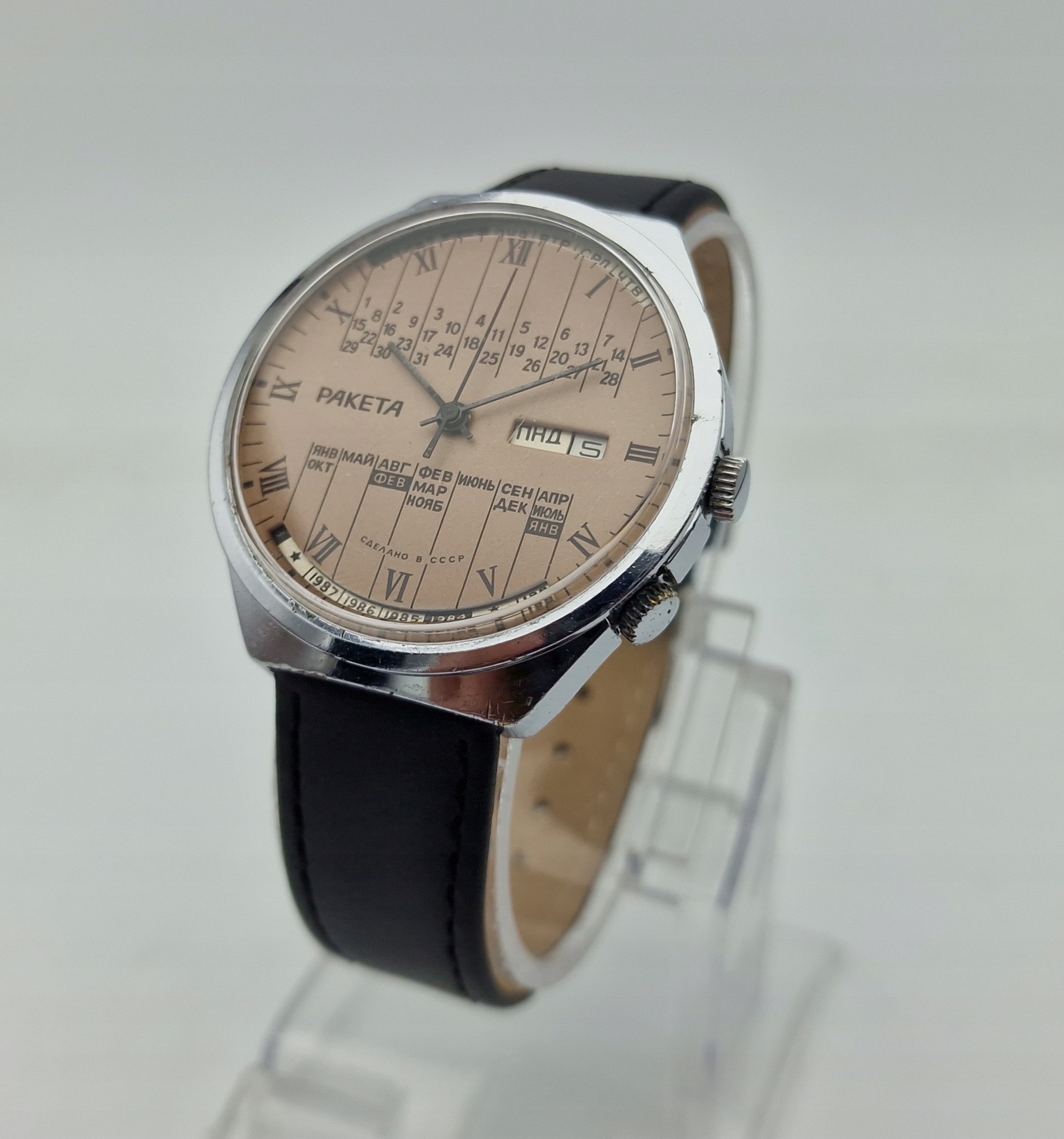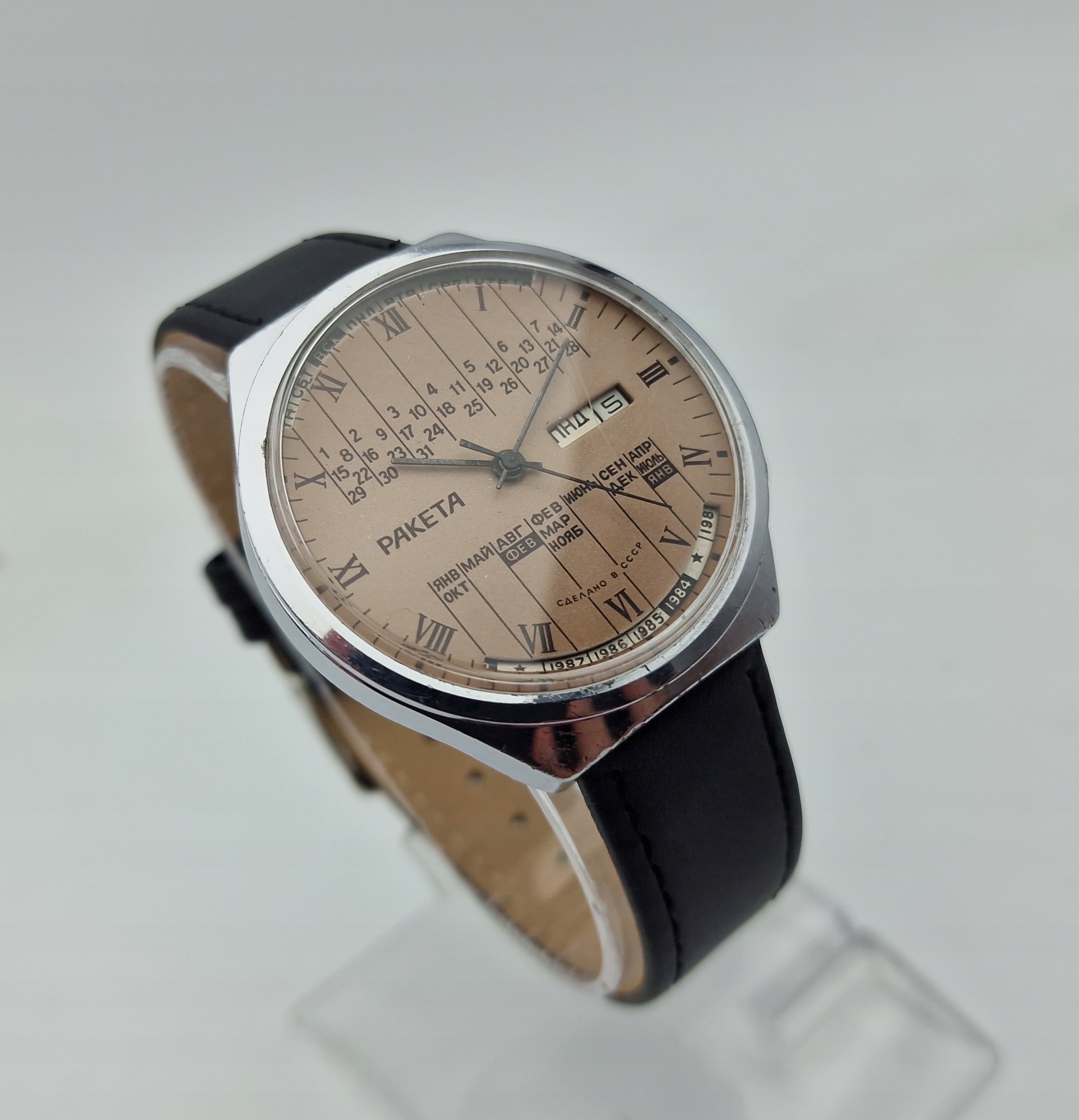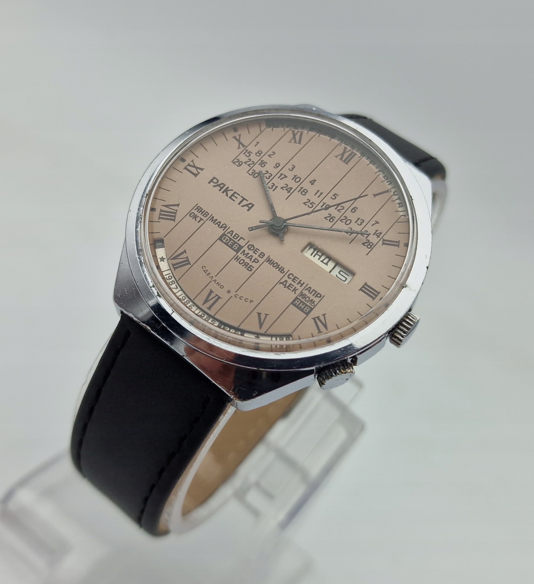 - Коричневий металевий циферблат із розширеним календарем. На щиті підпис: «РАКЕТА ЗРОБЛЕНА В CCCP». Циферблат в ідеальному стані, як на фото.