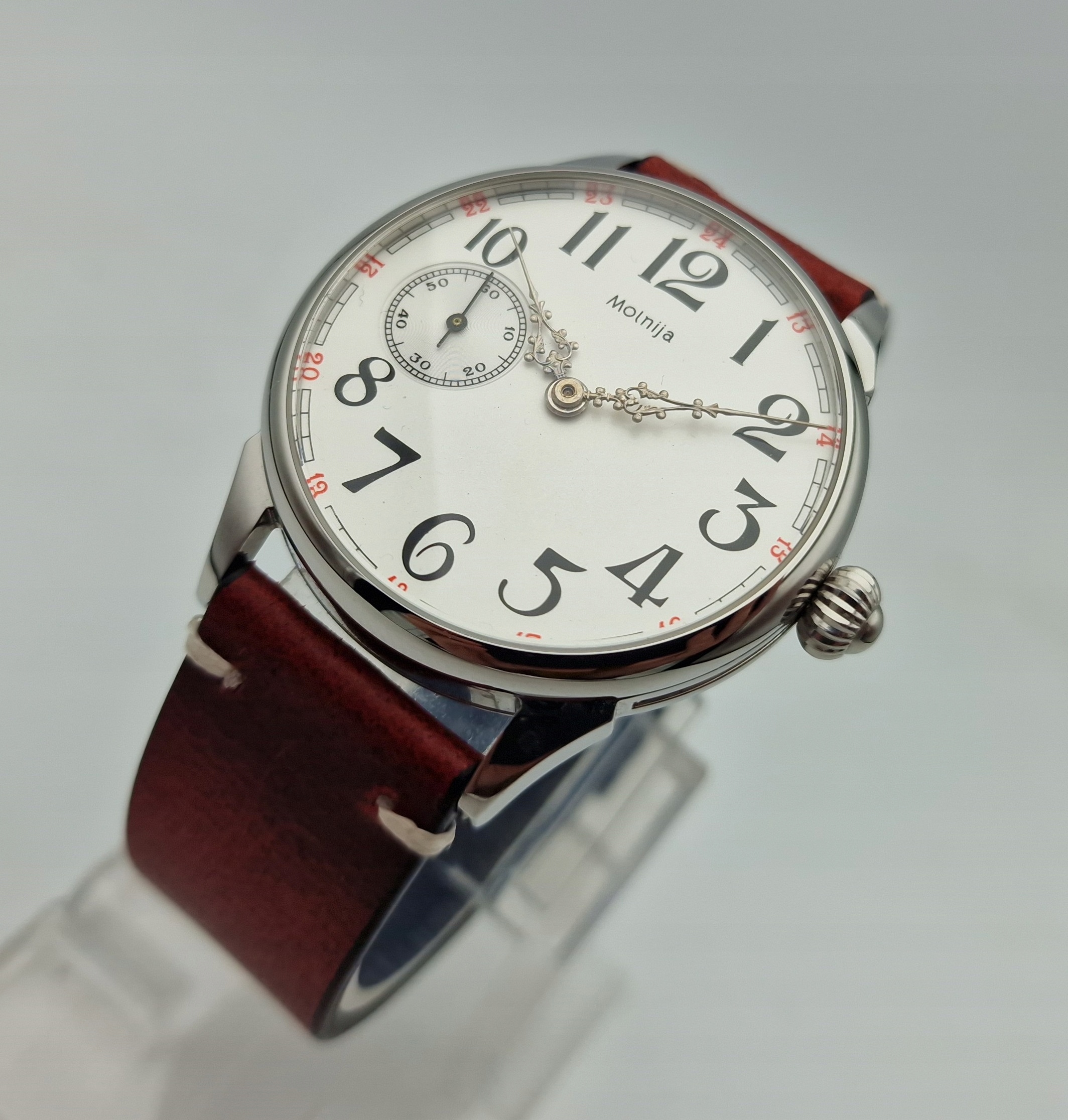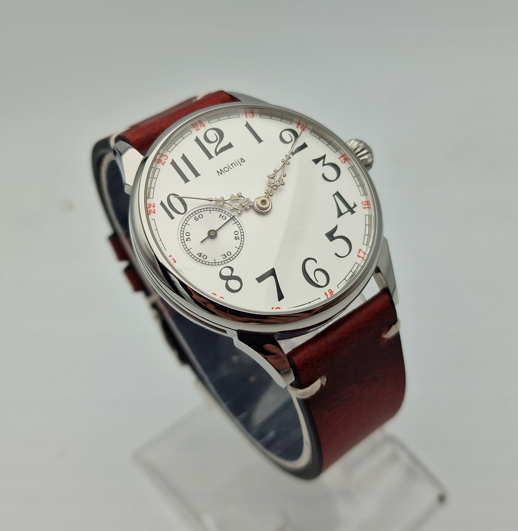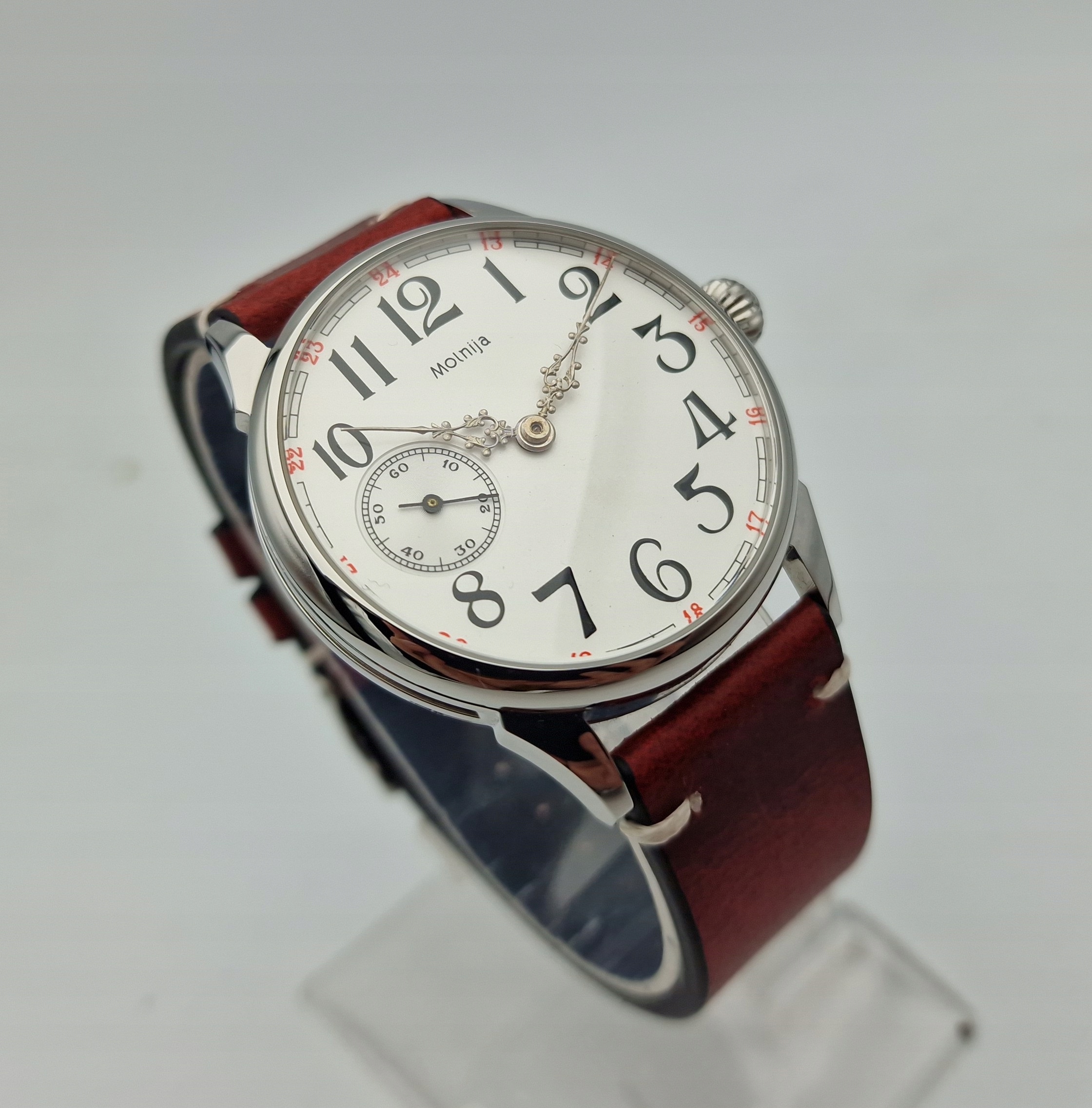 - Срібний циферблат з арабськими цифрами та окремою секундною стрілкою на дев’ятій годині з підписом: "MOLNIJA". Циферблат у ідеальному стані, як показано на фотографіях з аукціону.