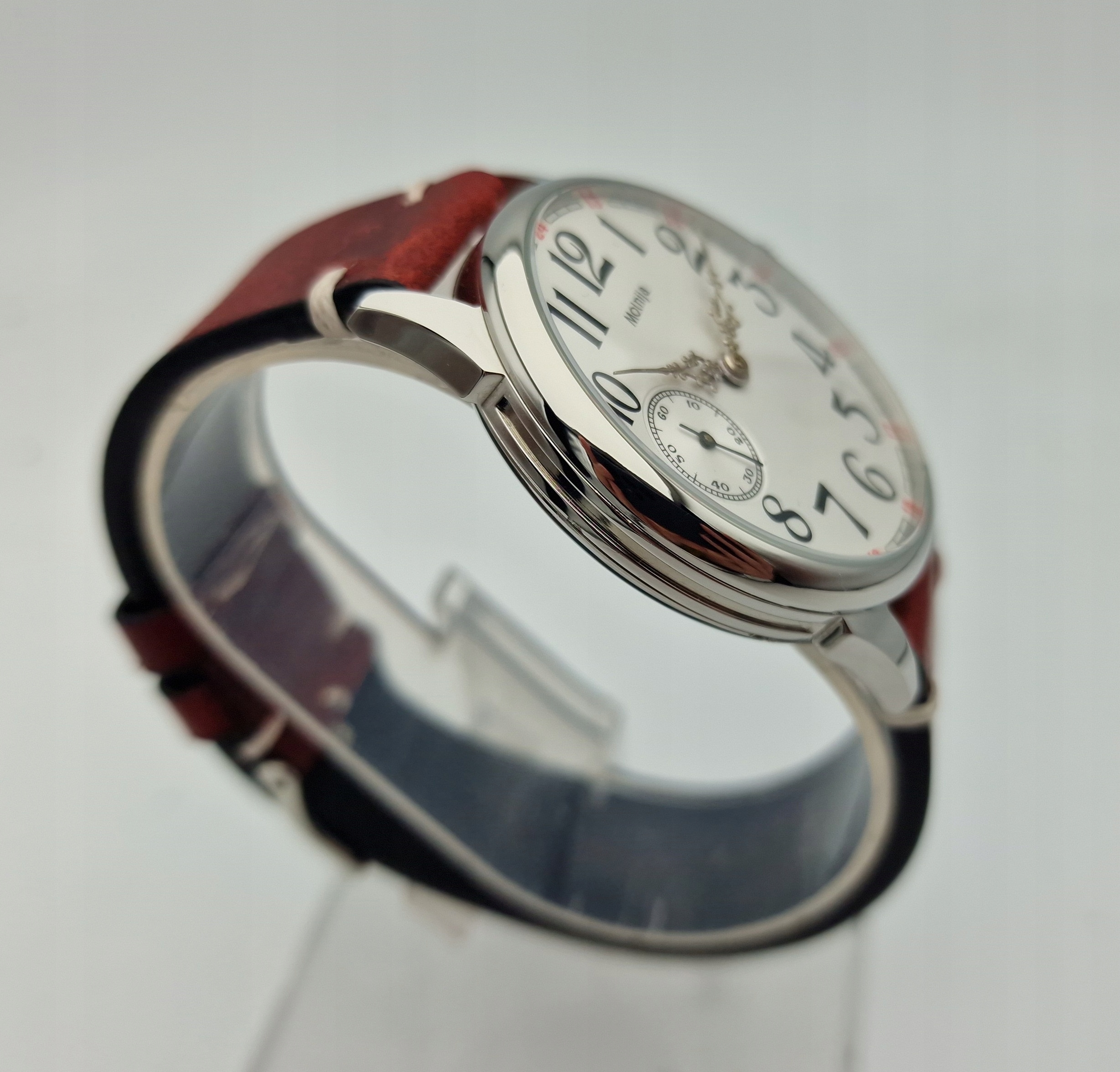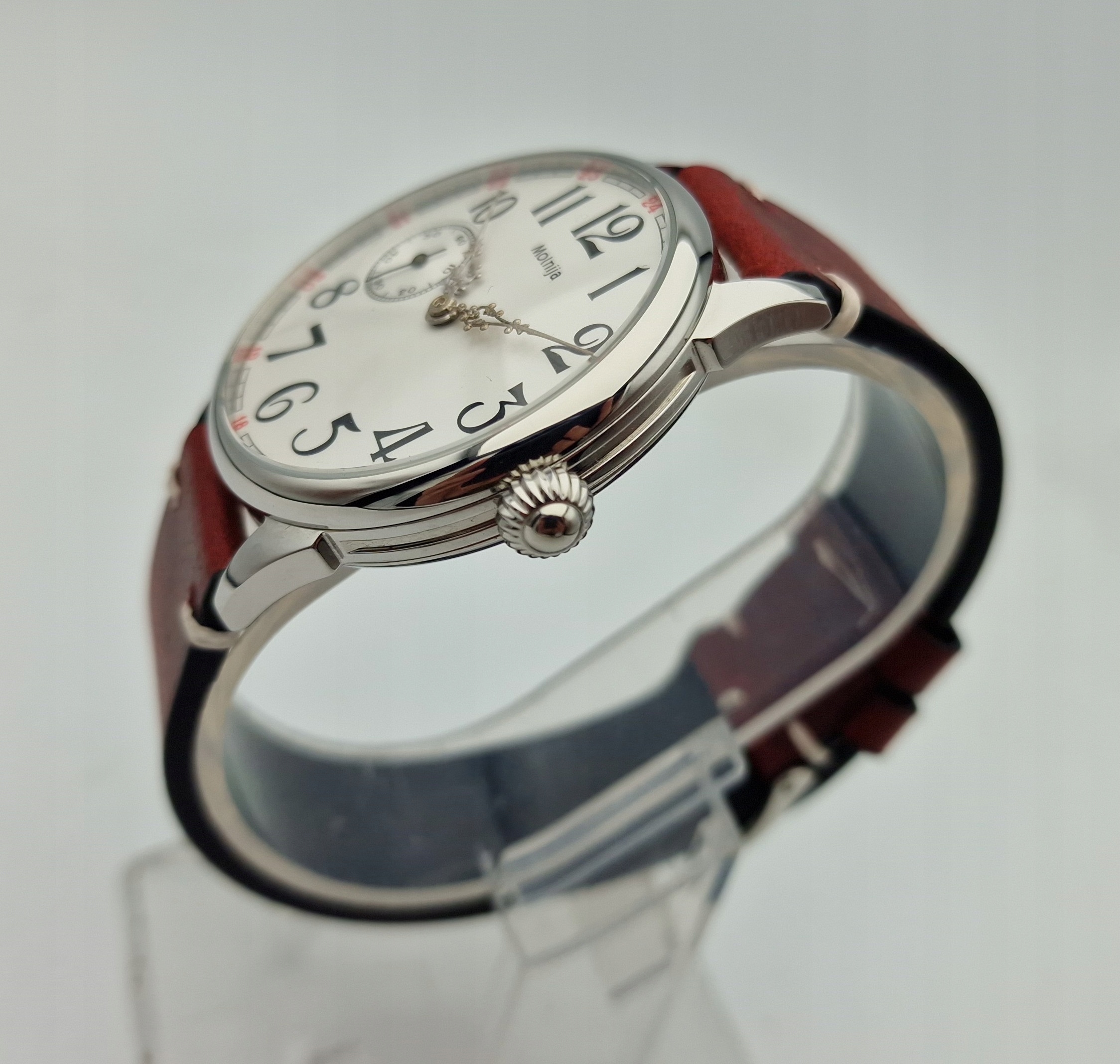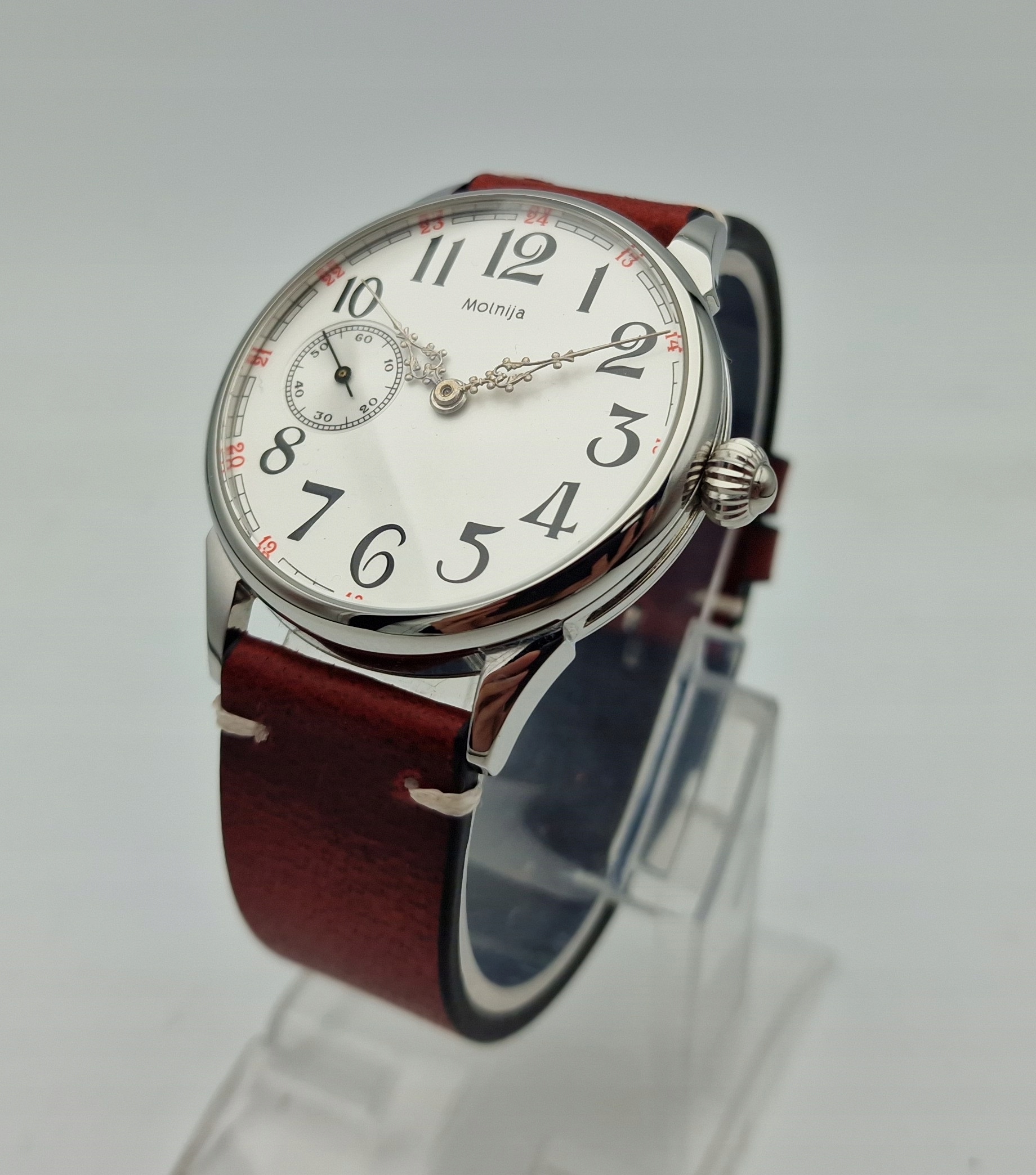 - Срібний циферблат з арабськими цифрами та окремою секундною стрілкою на дев’ятій годині з підписом: "MOLNIJA". Циферблат у ідеальному стані, як показано на фотографіях з аукціону.