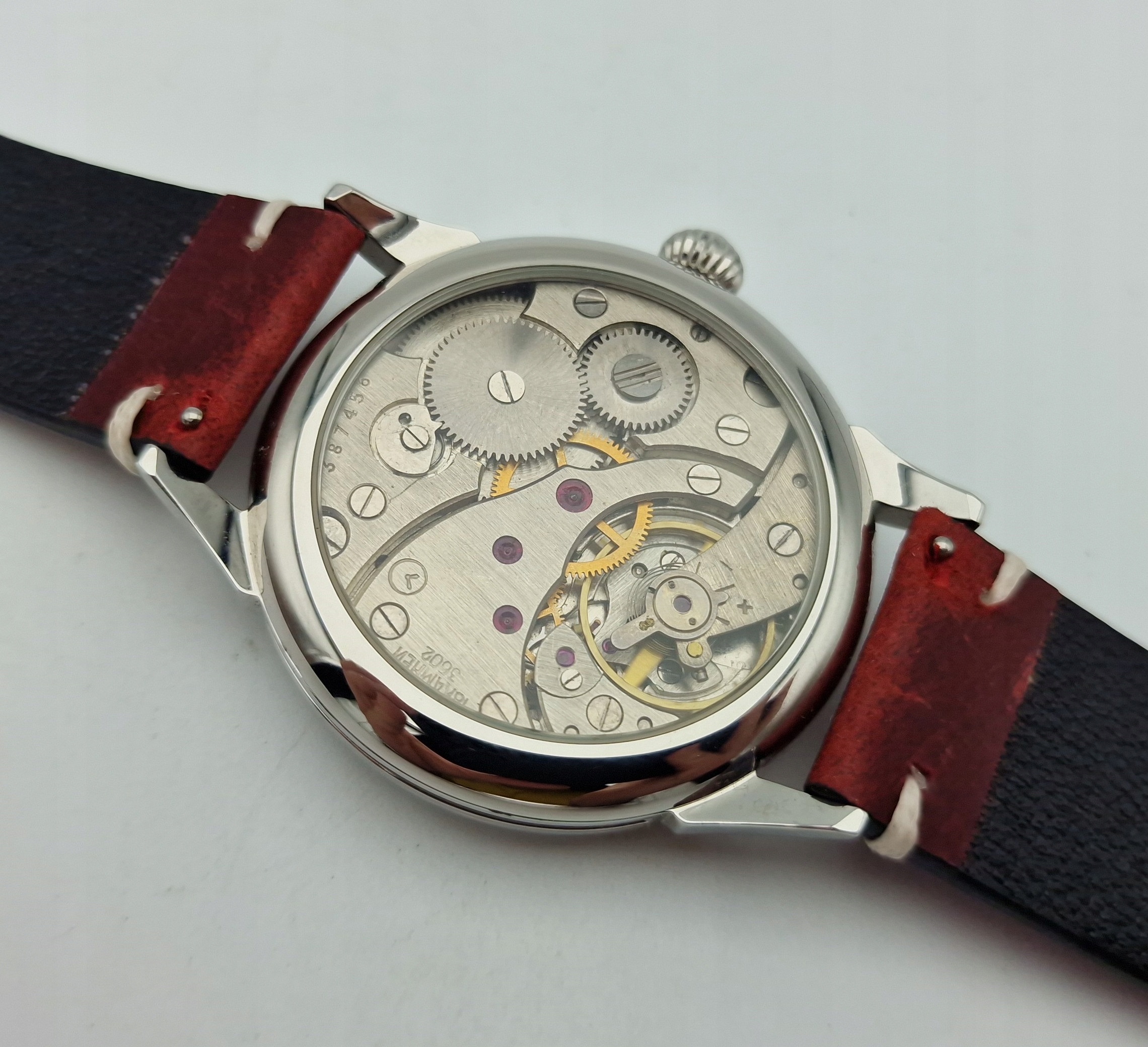 - Механізм годинника з 18 дорогоцінними каменями, з якорним спуском, з номерами: "3602, 18 КАМЕНІВ". Механізм після перевірки та обслуговування в хорошому робочому стані.