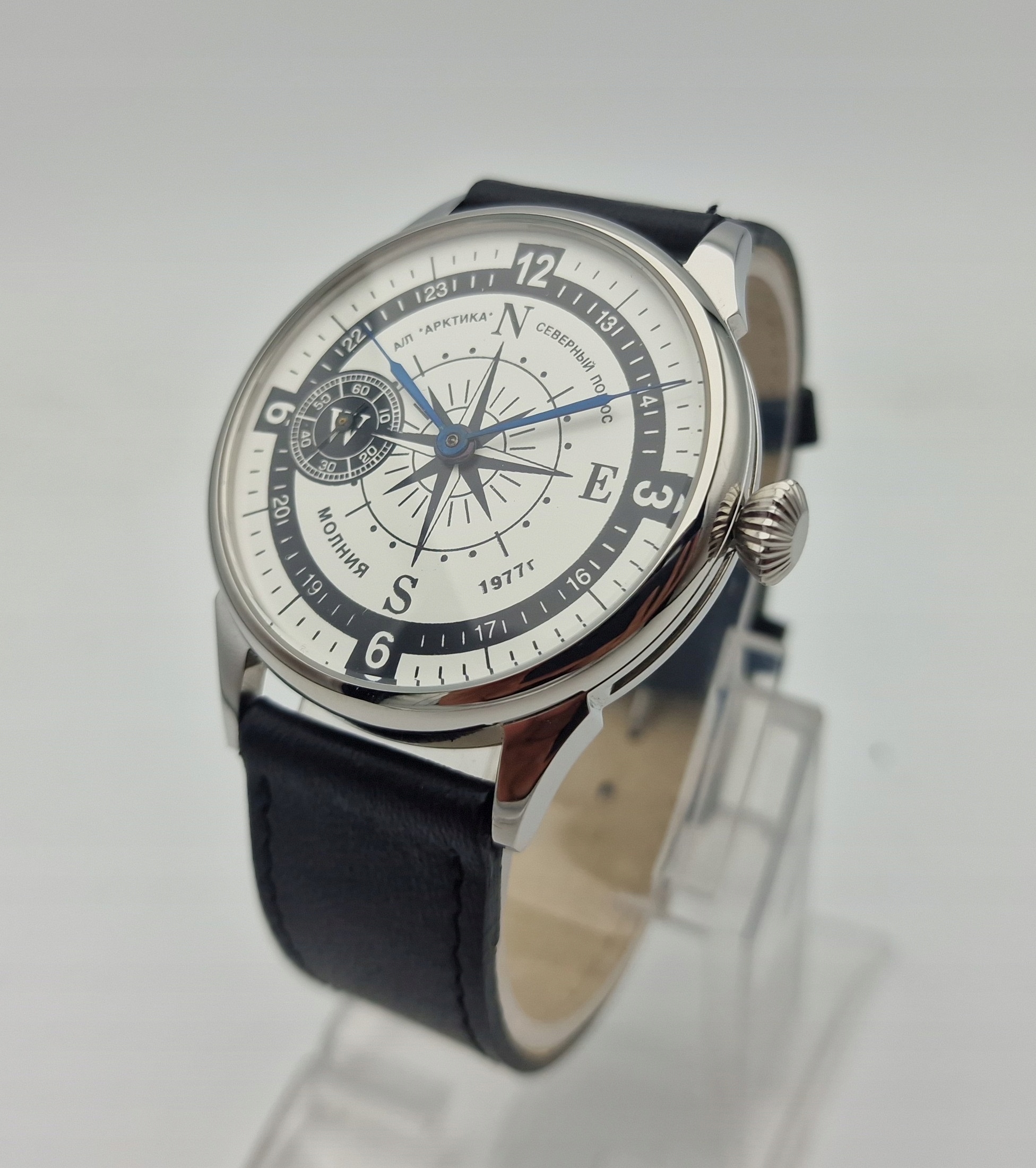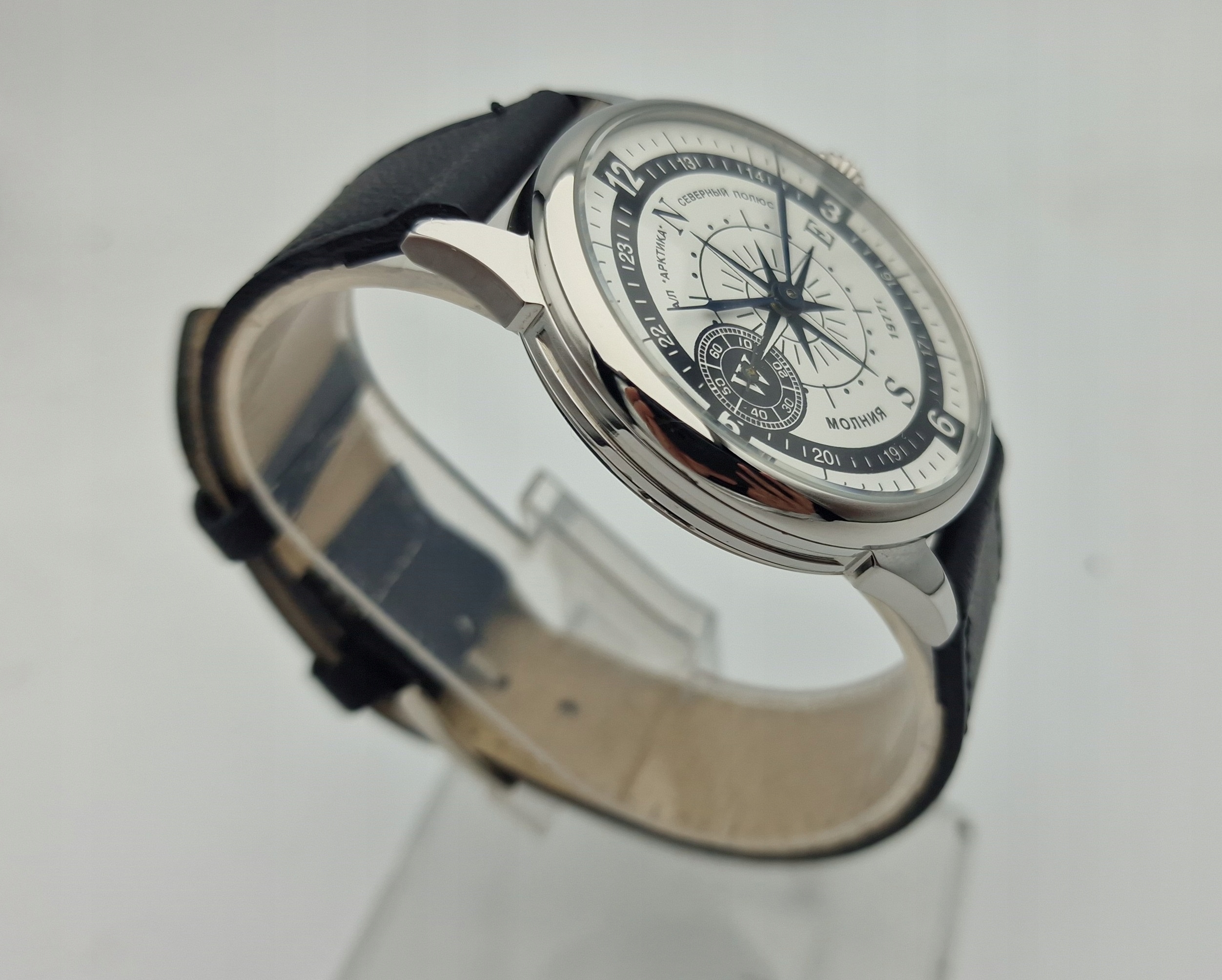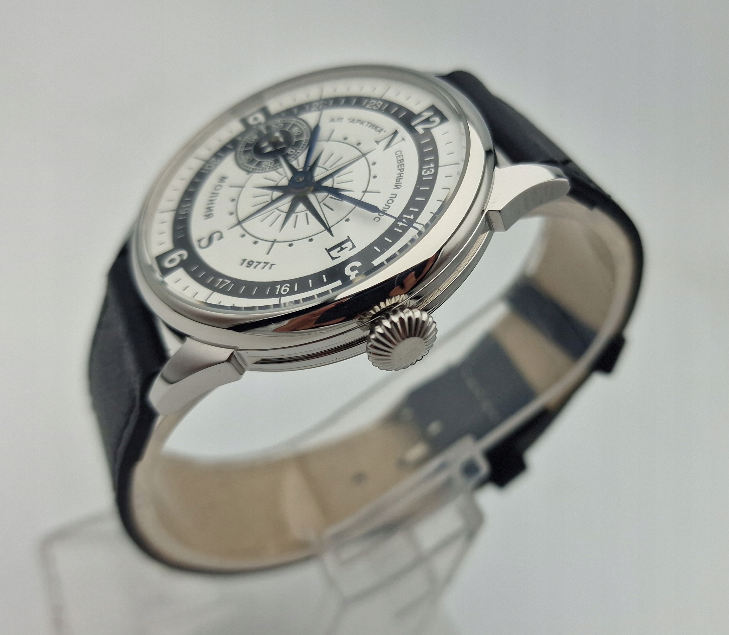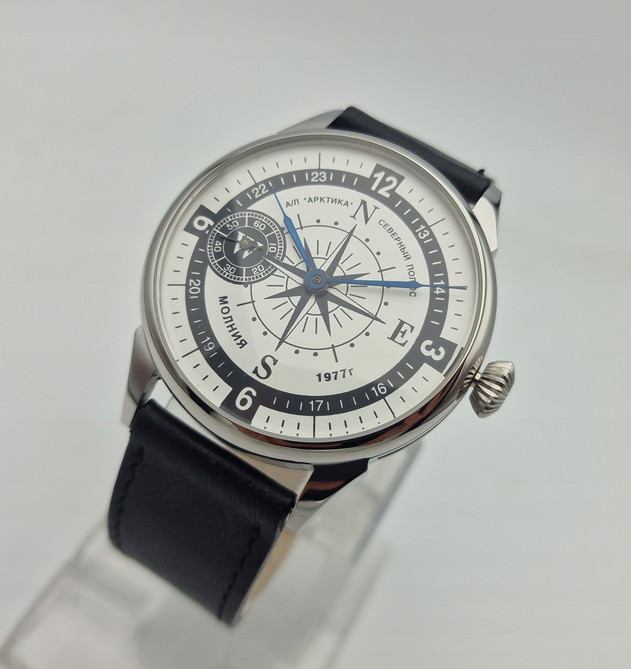 - Срібний циферблат з арабськими цифрами та окремою секундною стрілкою на дев’ятій годині з підписами: "MOLNIJA 1977, ARKTICA". Циферблат у ідеальному стані, як показано на фотографіях з аукціону.