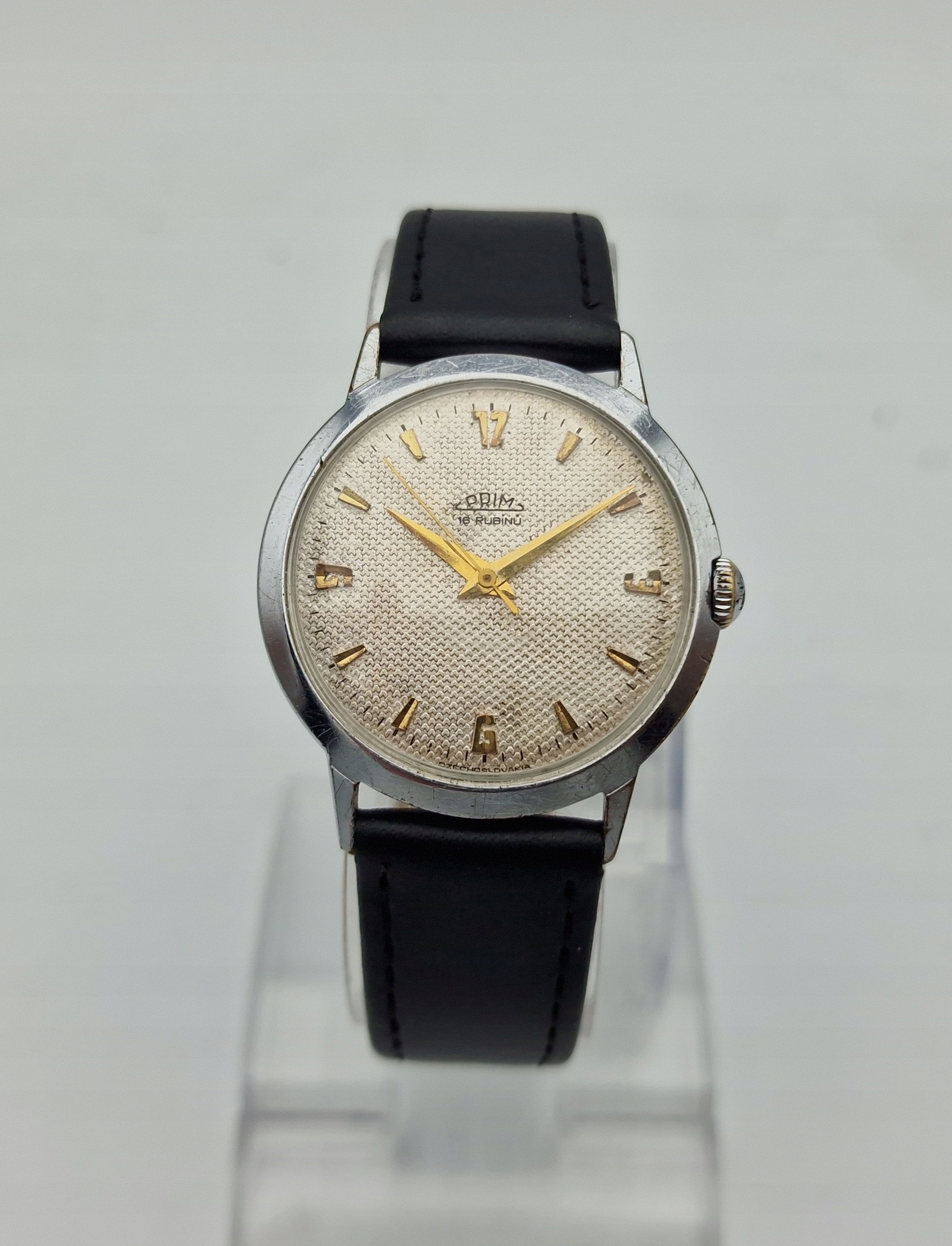 - Срібний металевий циферблат із золотими годинниковими мітками. Циферблат підписаний: «PRIM, 16 КАМЕНІВ, ЧЕХОСЛОВАЧЧИНА». Циферблат майже в ідеальному стані.