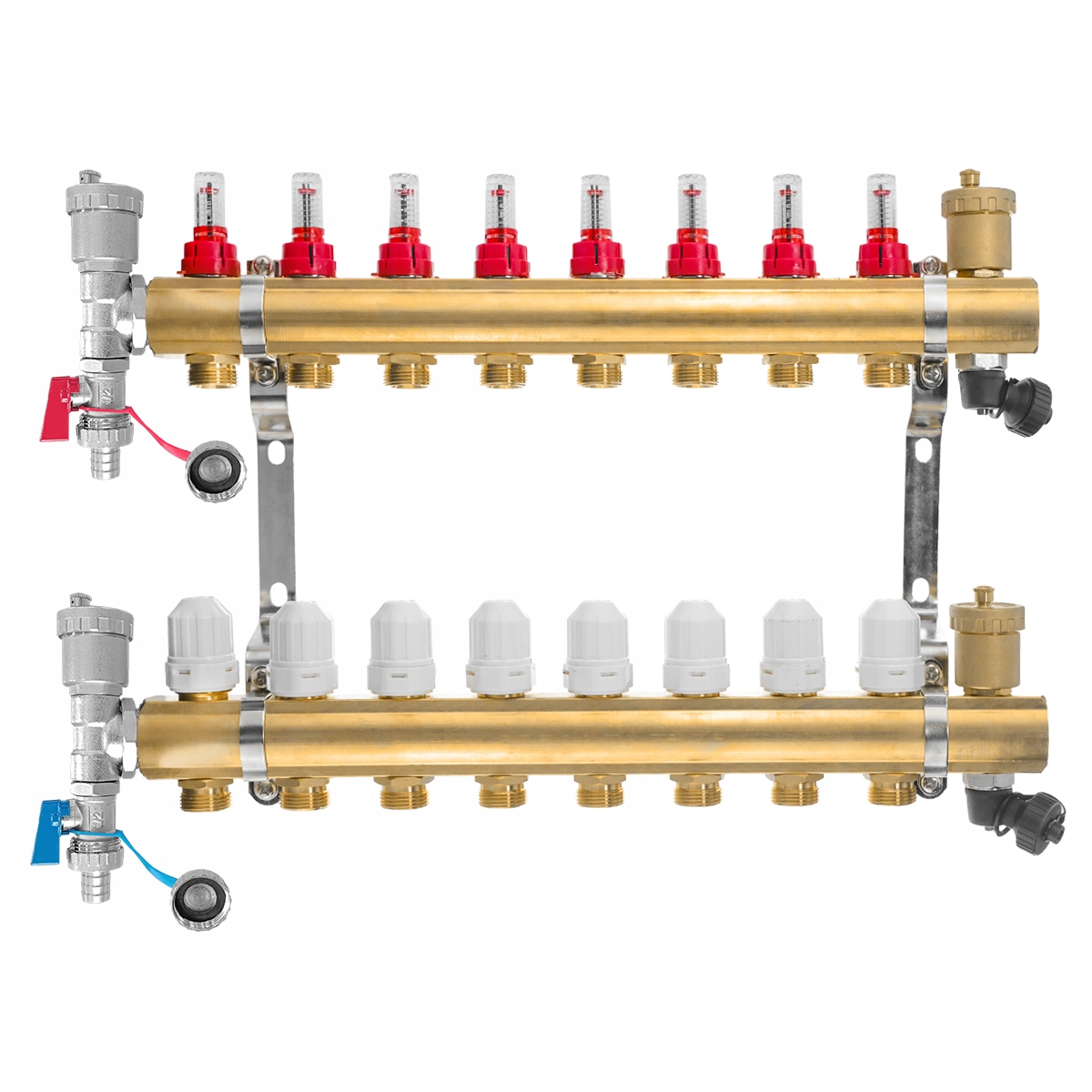 8-контурний латунний колектор, оснащений комплектом клапанів і вентиляційних отворів з монтажним комплектом