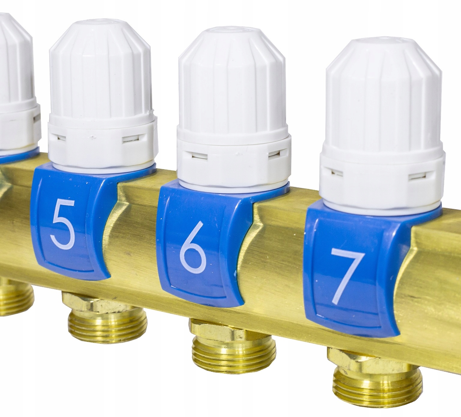 Набір розподільника с латунь для теплої підлоги в будівлях. Оснащений: роз'ємами монтаж, клапани вентиляційні, крани зливні кульові, вентилі термостатичні без головки, ротаметри 0,5 -5л/хв, кронштейн кріплення. Нижня балка оснащена вставками термостатичний М30х1,5