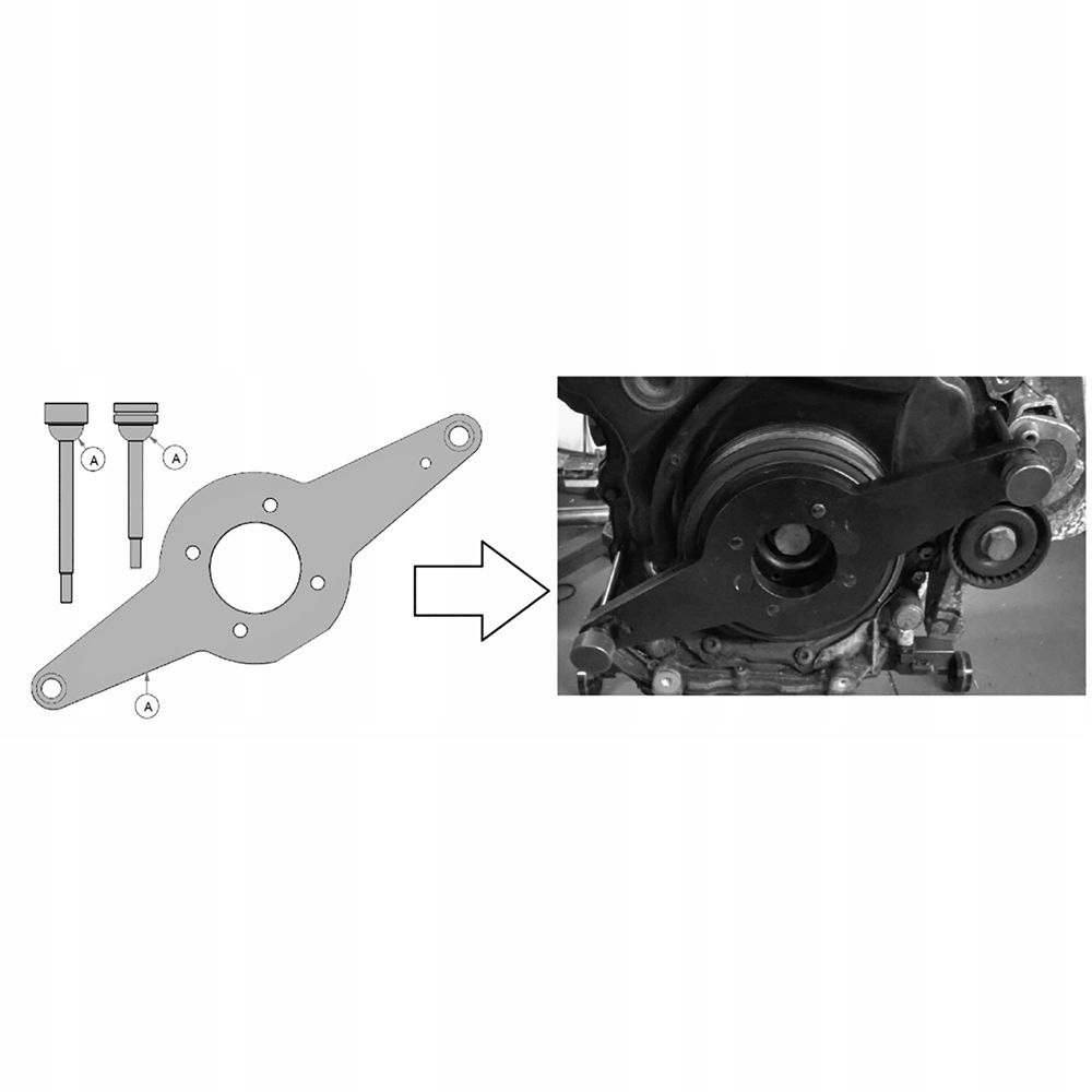 Враховуючи, що на ланцюговій зірочці немає шпонкової канавки, коли центральний болт буде видалено та двигун обертається, положення розподільного вала буде втрачено. Цей спеціалізований набір містить необхідні інструменти, необхідні для підтримки тимчасового положення, коли ремонт вимагає зняття гасителя вібрації