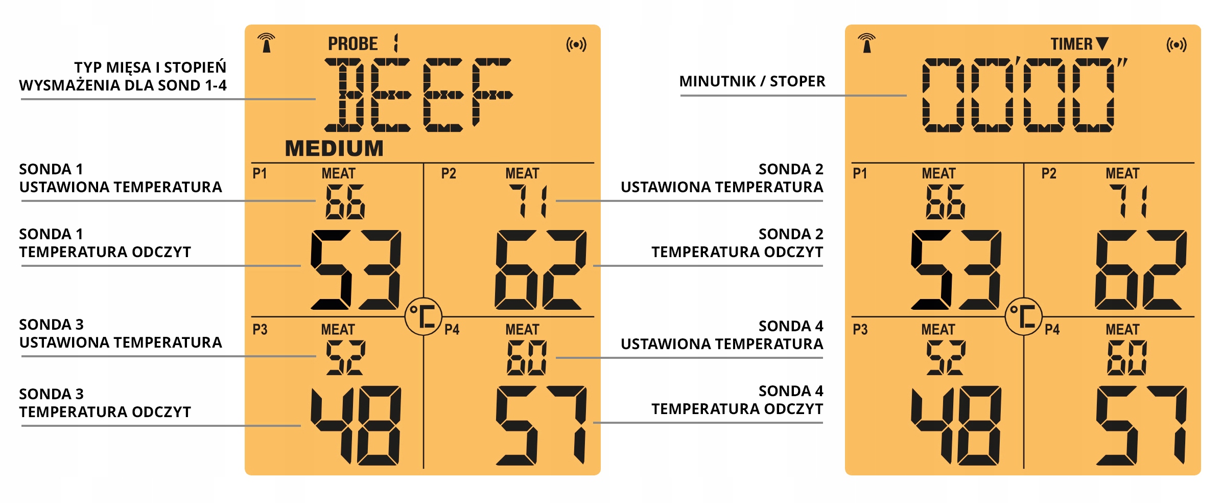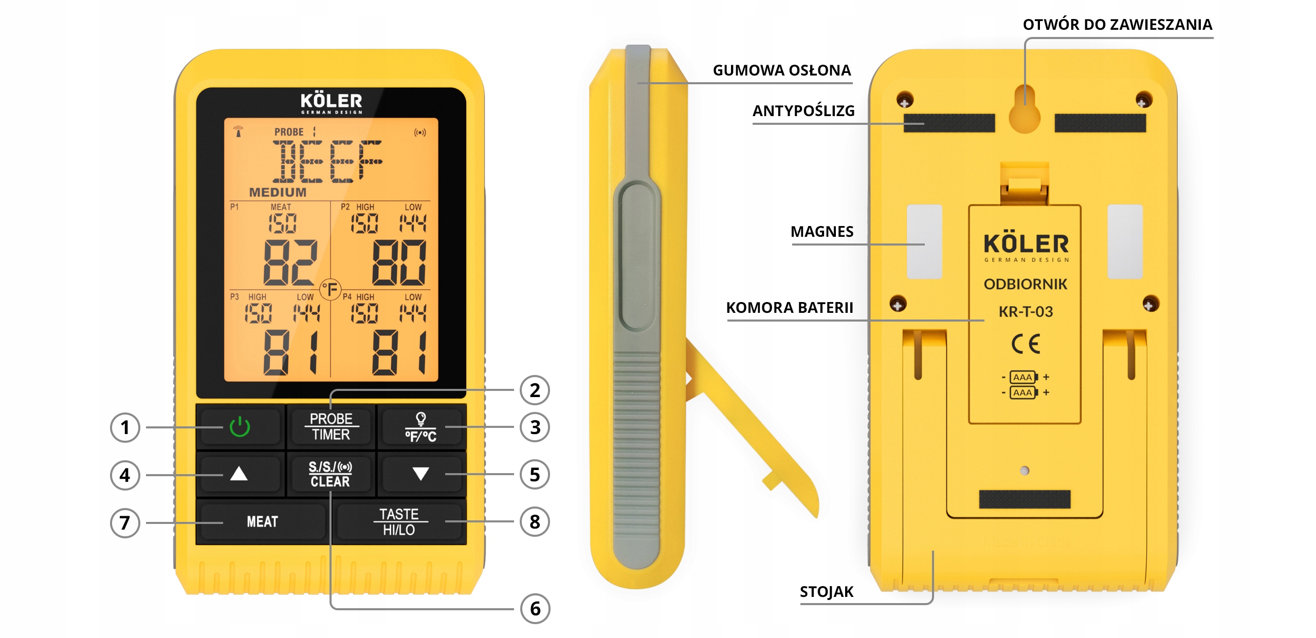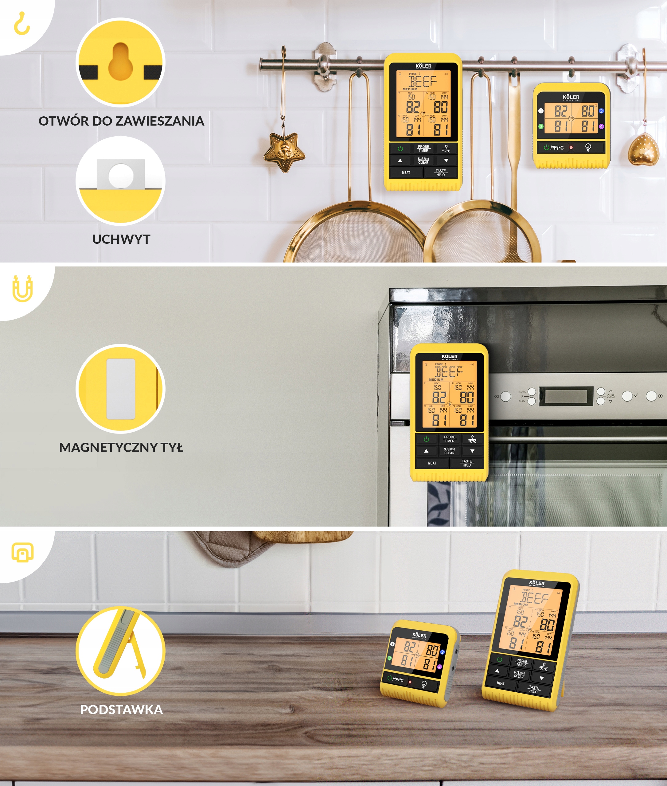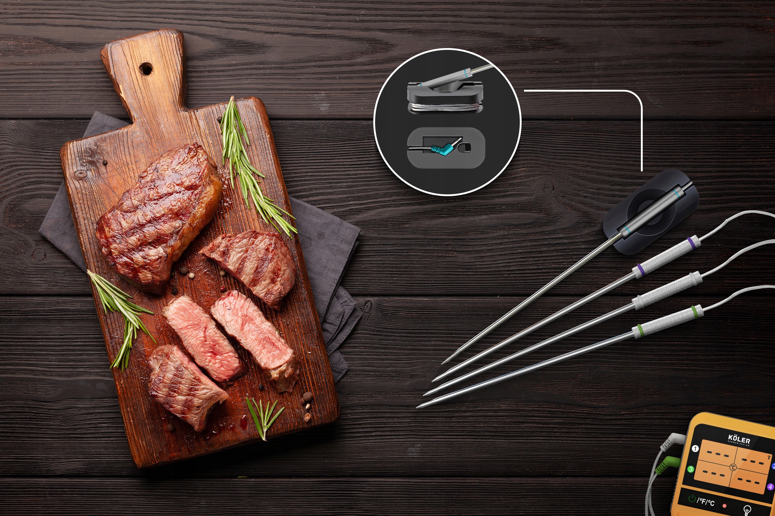 Оснащений чотирма зондами з нержавіючої сталі з можливістю безперервного незалежного моніторингу температури в чотирьох різних посудах одночасно. Поки передавач нашого термометра KÖLER спостерігатиме за всім на грилі, ви можете насолоджуватися вільним часом з друзями далеко від гриля. Завдяки дистанційному сигналу ви можете віддалятися до 300 метрів, все, що вам потрібно, це приймач, оснащений великим, читабельним РК-дисплеєм.