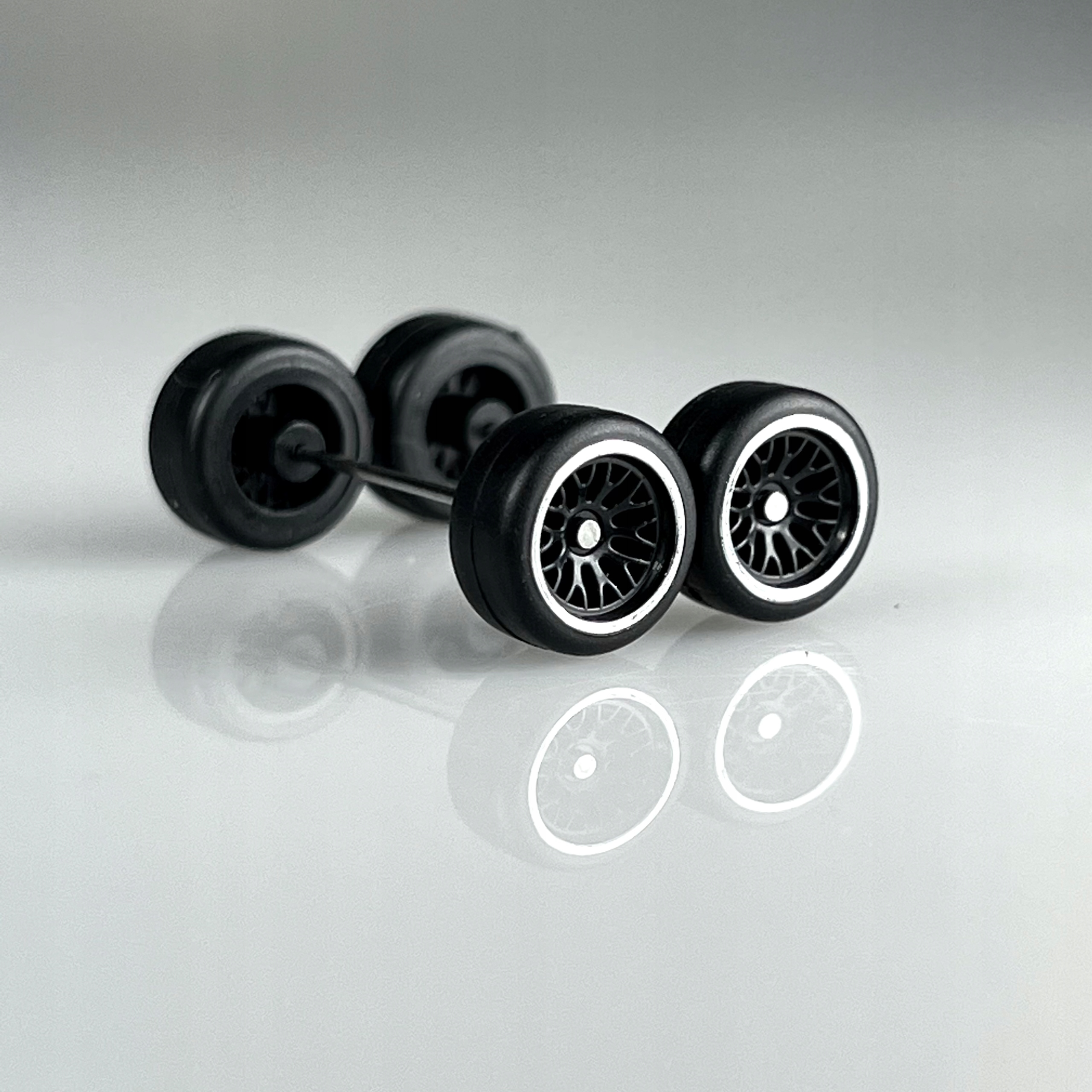 Колеса 1:64 Чорний, срібний край, колеса, як BBS, гумові шини. Для гарячих коліс