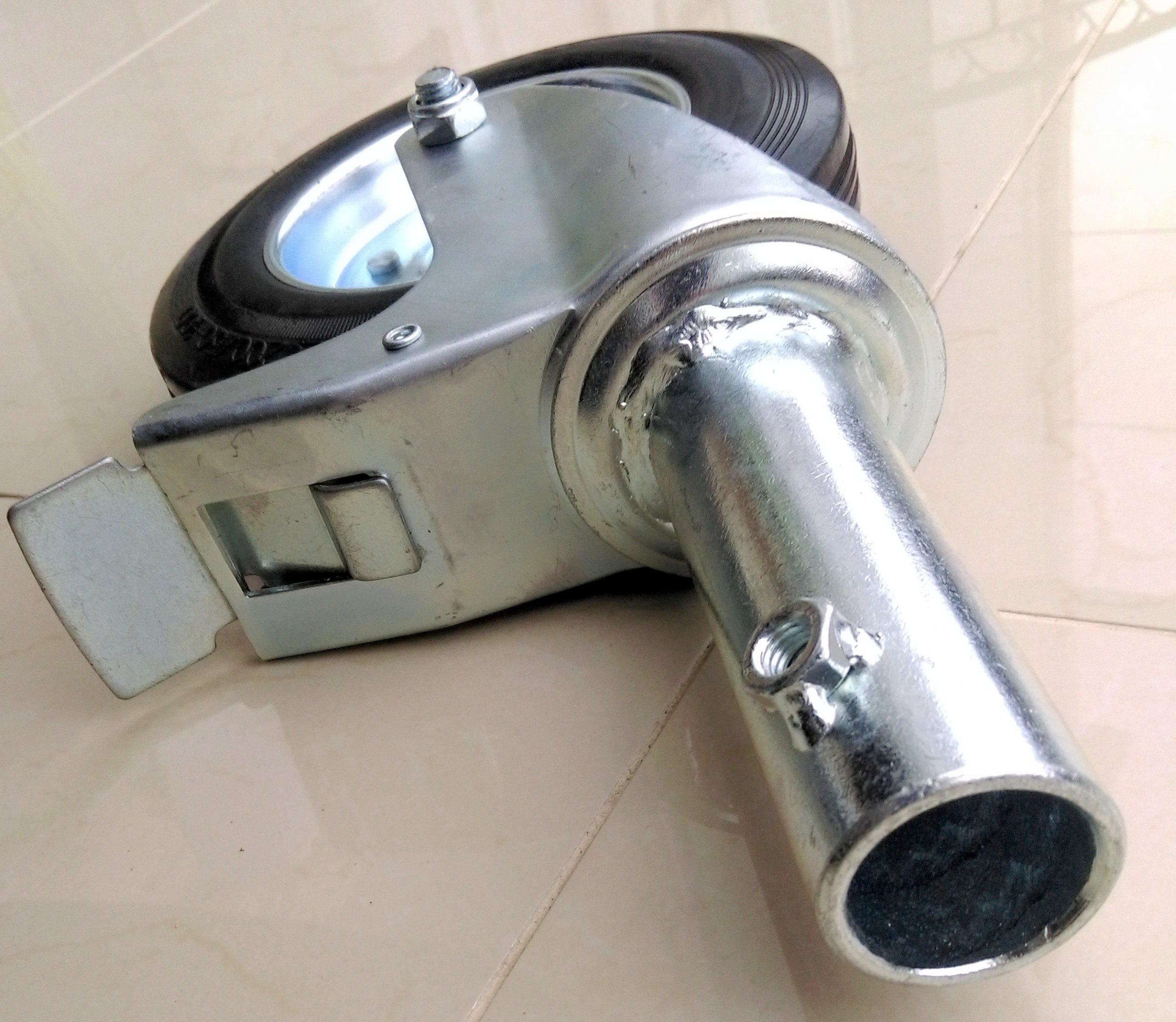 Поворотні колеса з гальмом, встановлені на цапфі, являють собою комбінацію вилки з пресованого сталевого листа і колеса зі сталевою втулкою і суцільною чорною гумовою шиною. Поворотна головка вилки має подвійні підшипники. Металеві елементи набору покриті антикорозійним хромоцинковим покриттям, в тому числі і штифт.