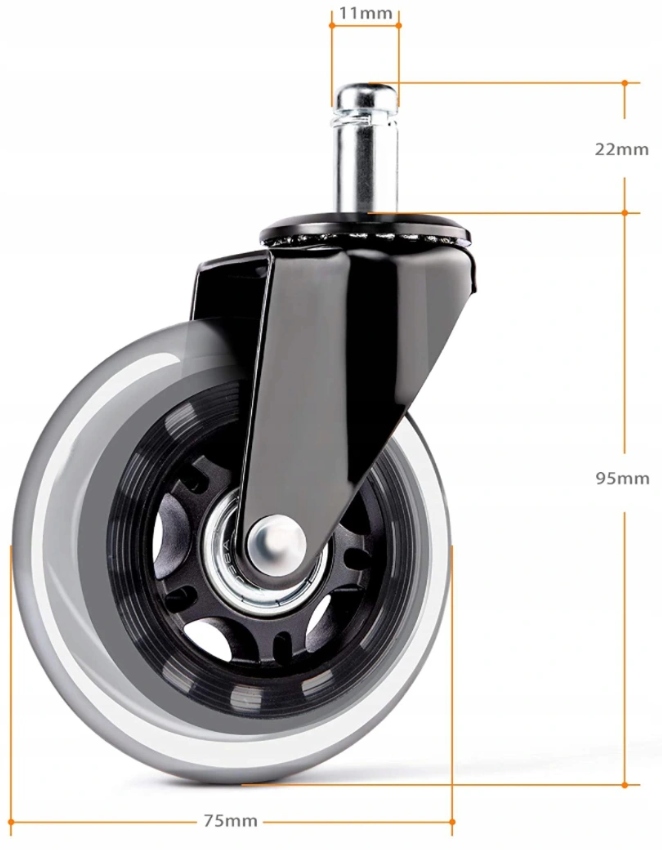 ▶ Колеса розроблено з урахуванням максимальної можливої універсальності. Завдяки цьому ми отримали модель, яка одночасно підходить для офісних крісел, обертових крісел, ігрових крісел, табуретів, меблів тощо.
