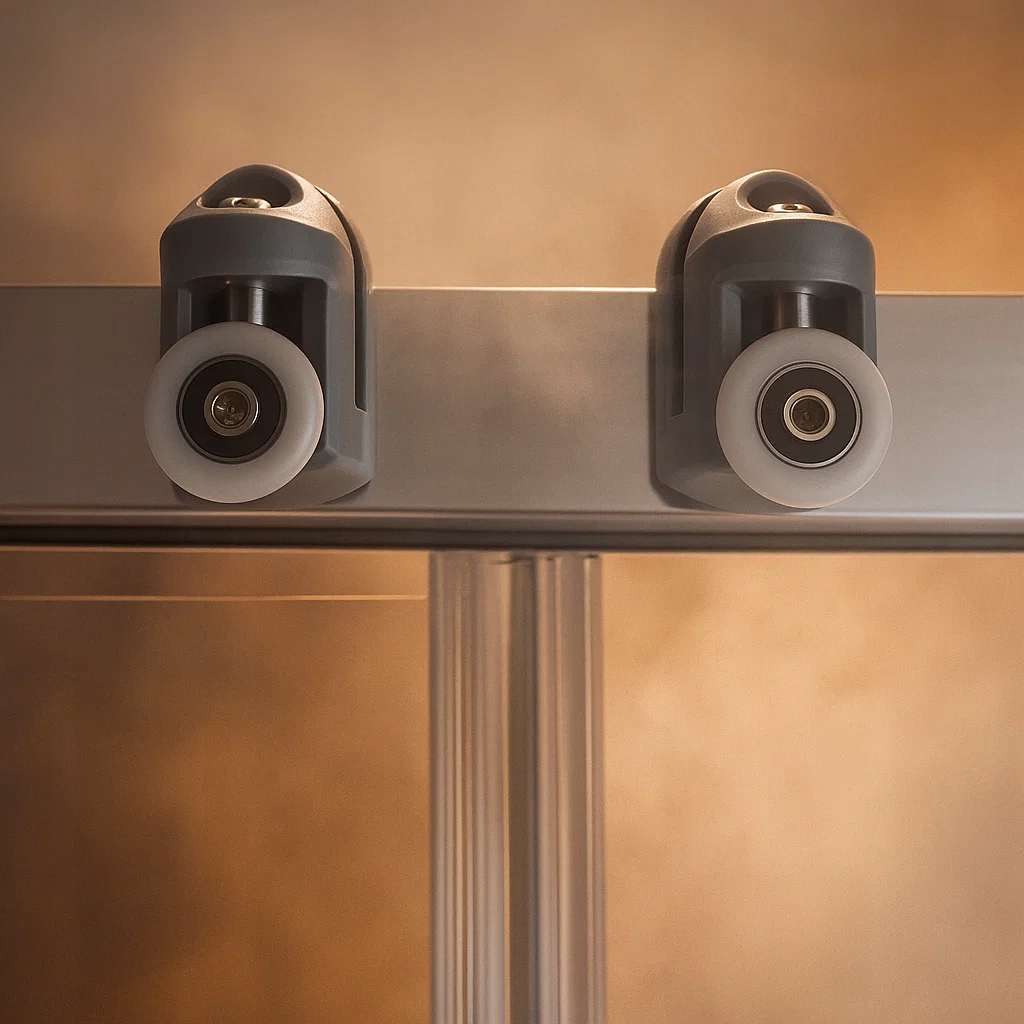 - Ролики забезпечують плавне та безшумне відкривання та закривання душових дверей.
