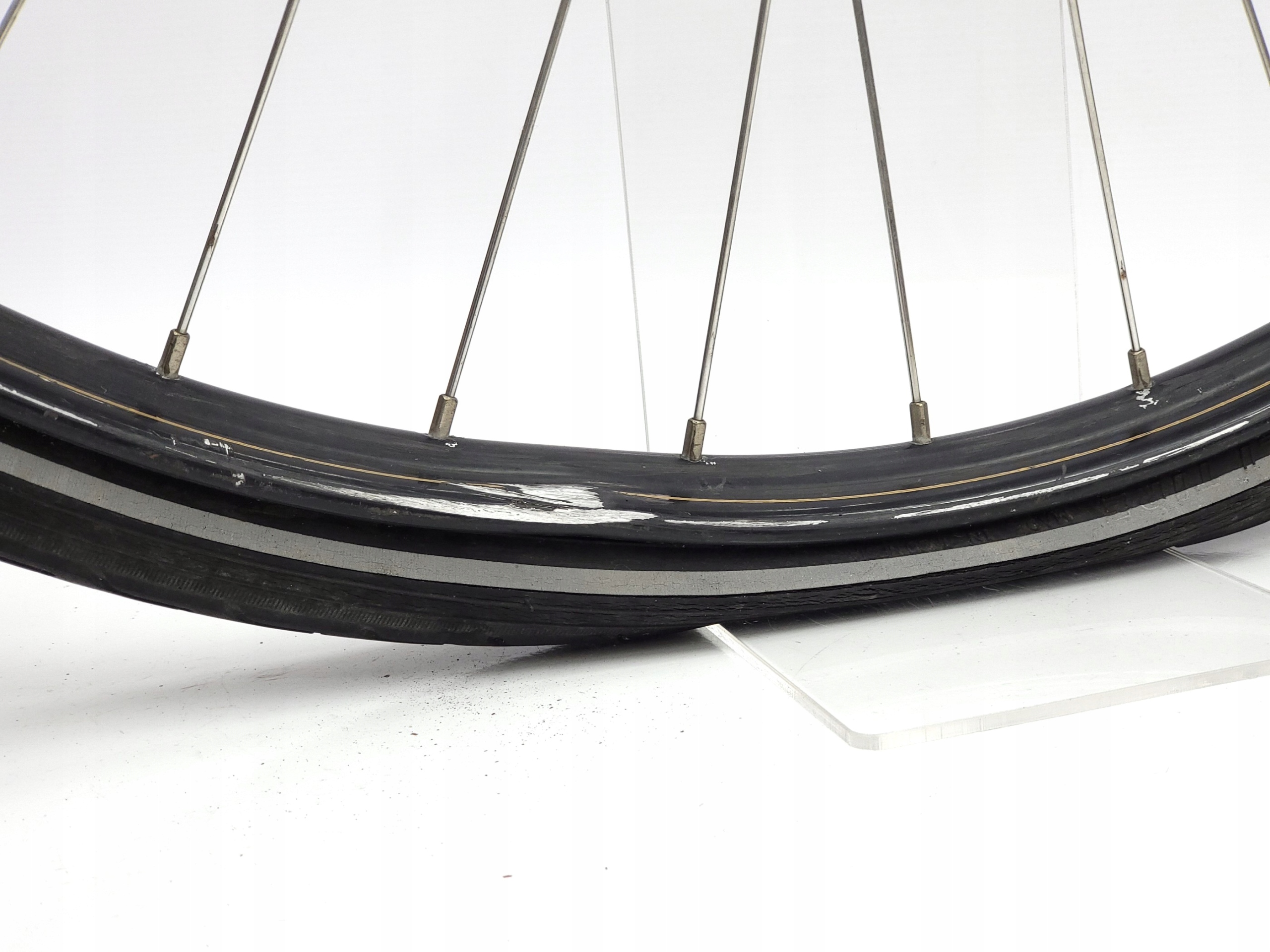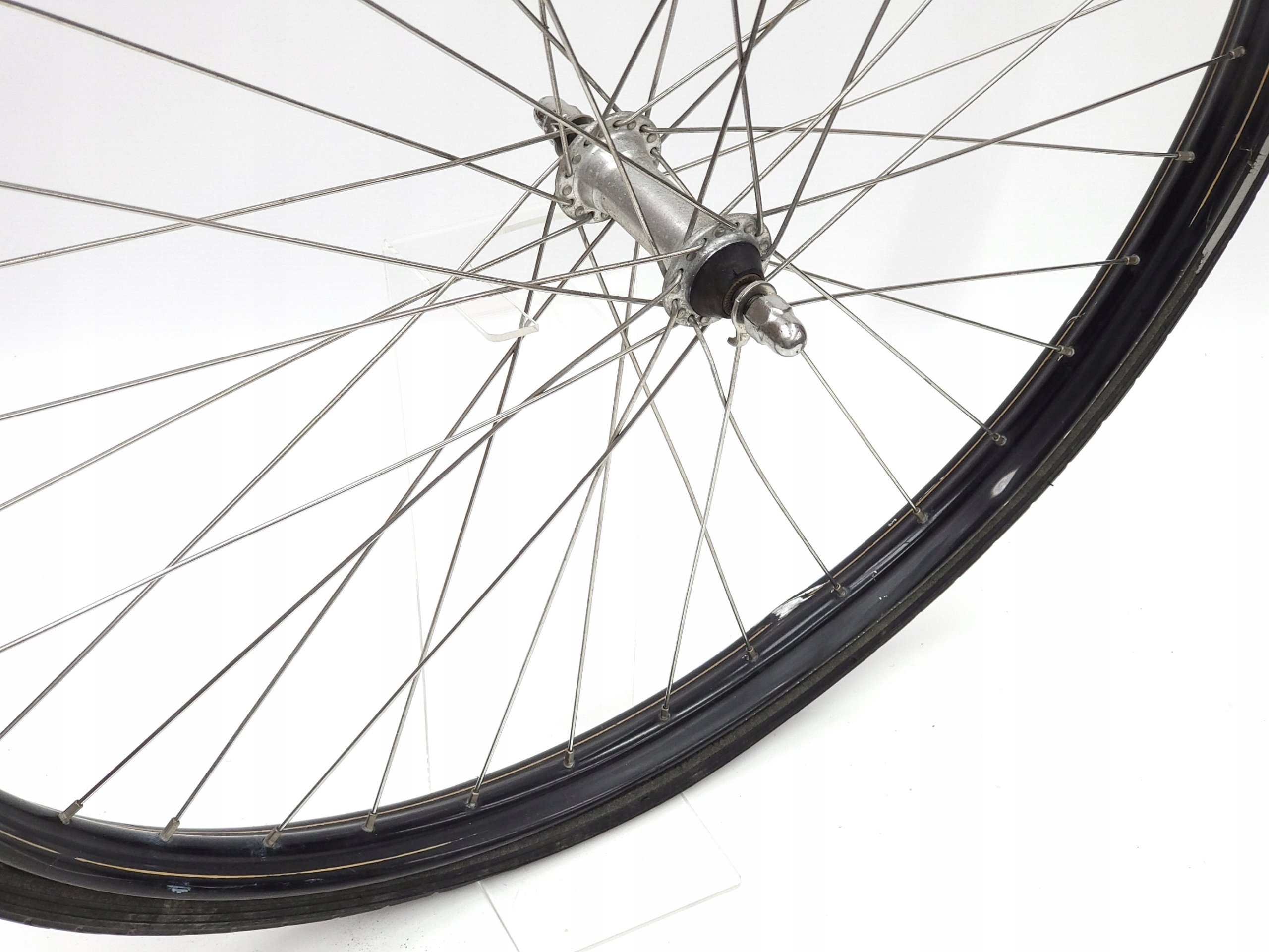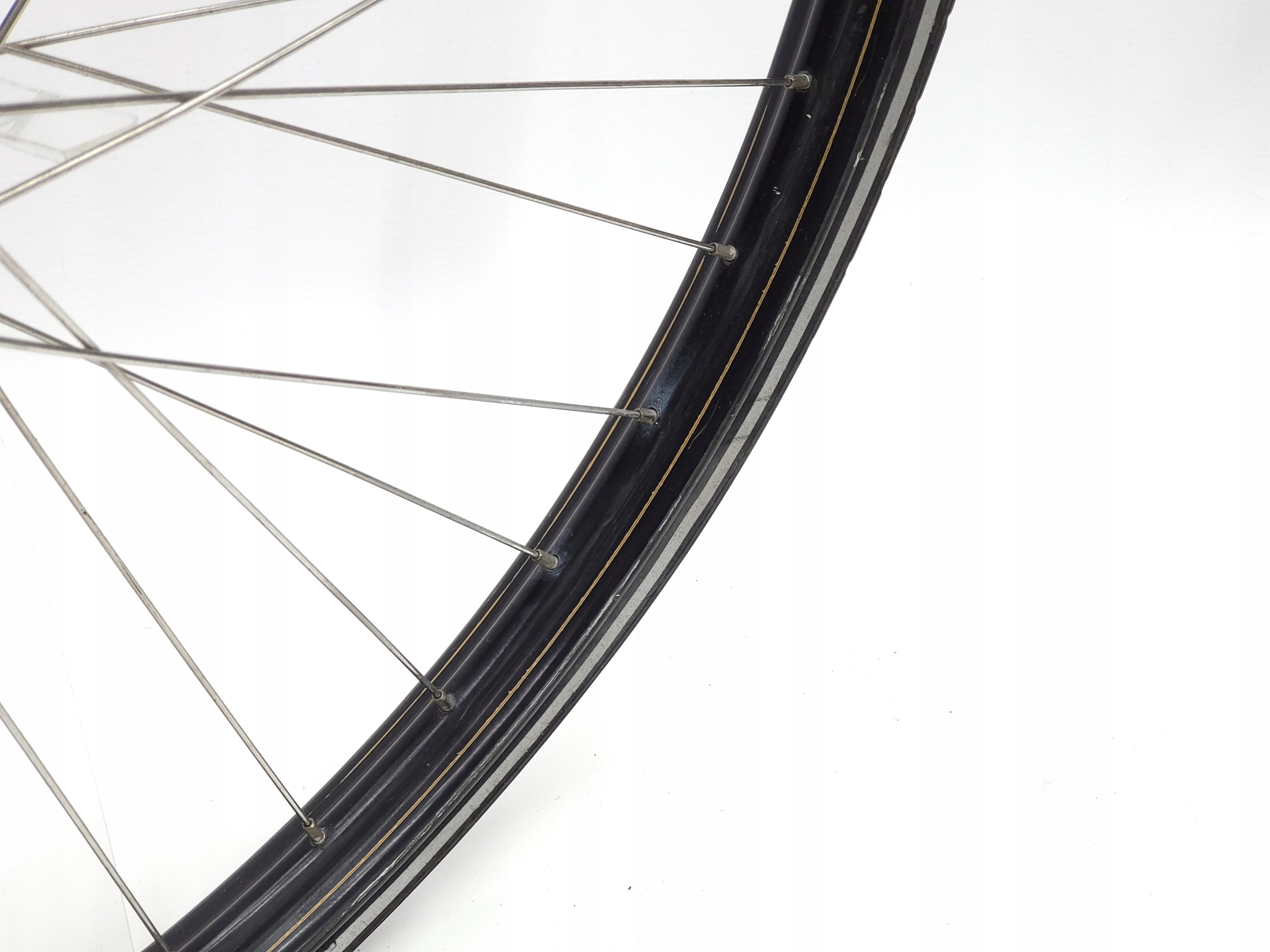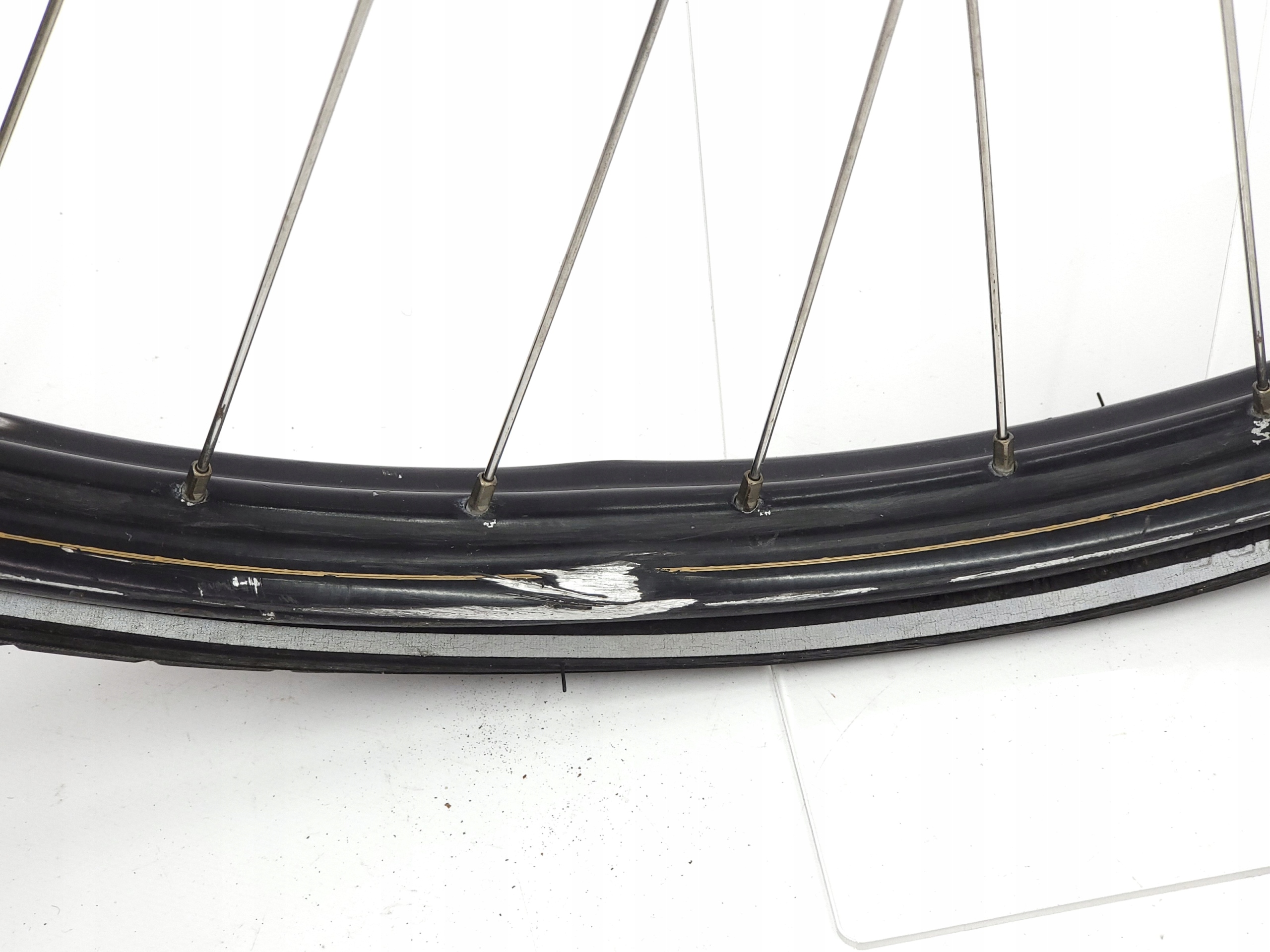 Ми пропонуємо передній чорний широкий обід 28 дюймів для велосипедів. Діаметр: 64,5 см. Колесо притиснуте до бордюру в одному місці, тому воно погнуте - потребує рихтування, шина в хорошому стані, потрібна заміна камери.