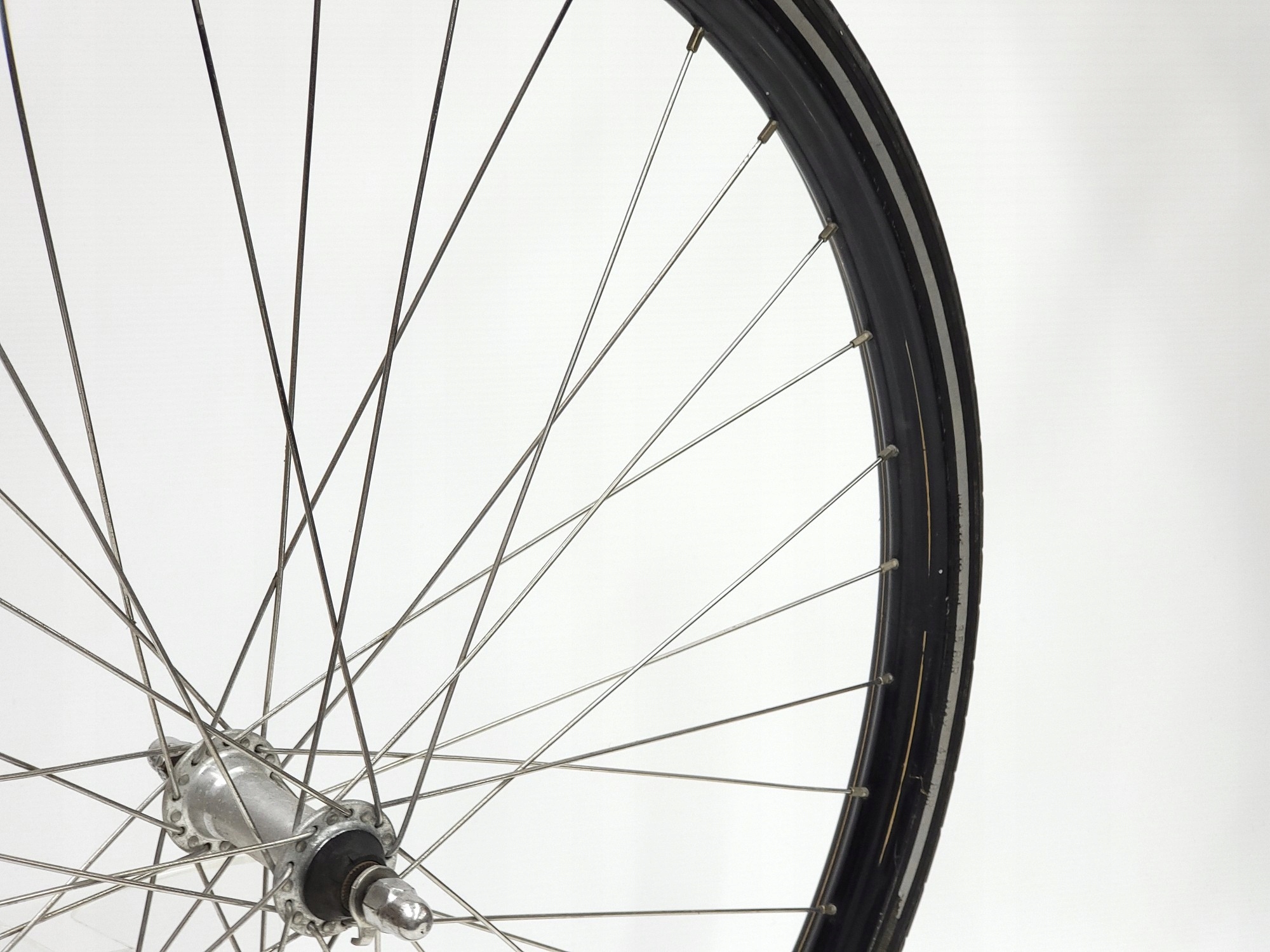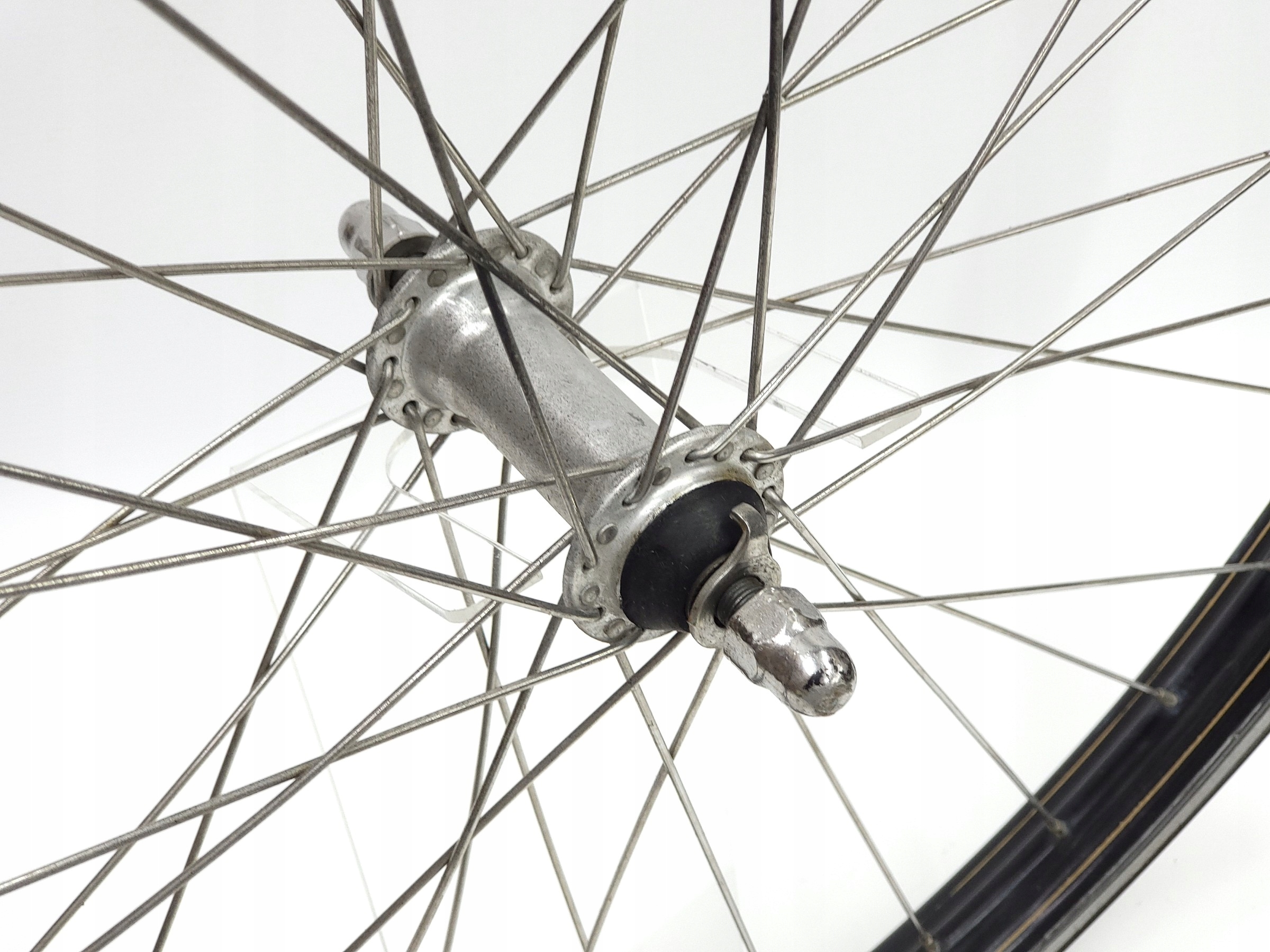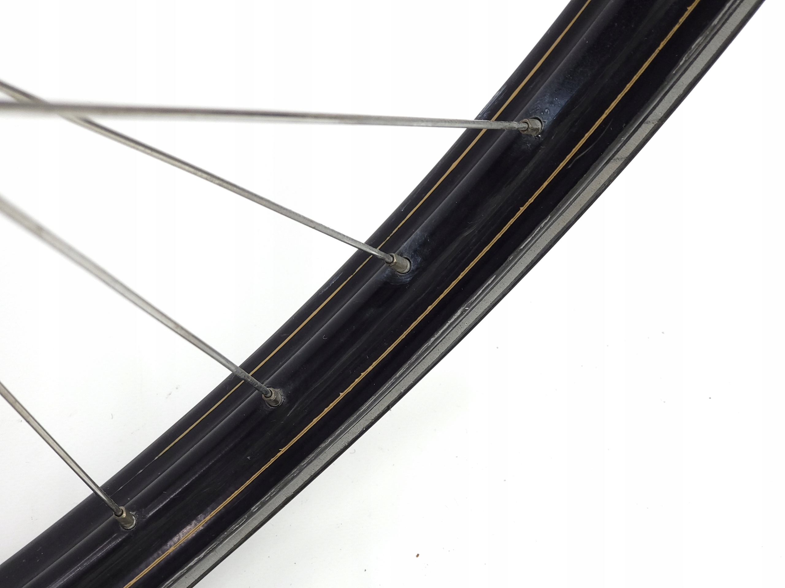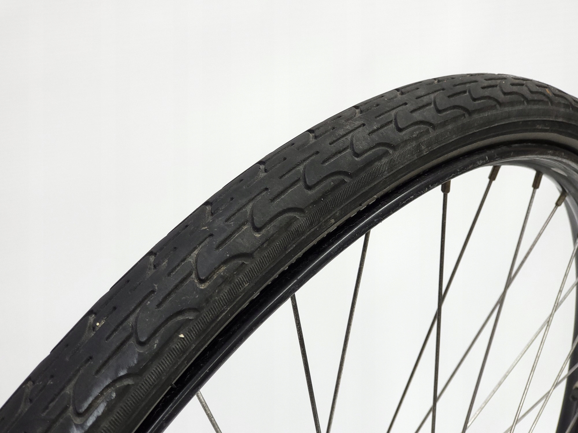 Ми пропонуємо передній чорний широкий обід 28 дюймів для велосипедів. Діаметр: 64,5 см. Колесо притиснуте до бордюру в одному місці, тому воно погнуте - потребує рихтування, шина в хорошому стані, потрібна заміна камери.
