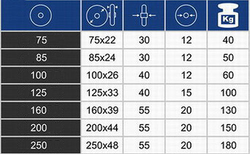 (доступні діаметри колеса: від 75 до 250 мм) :