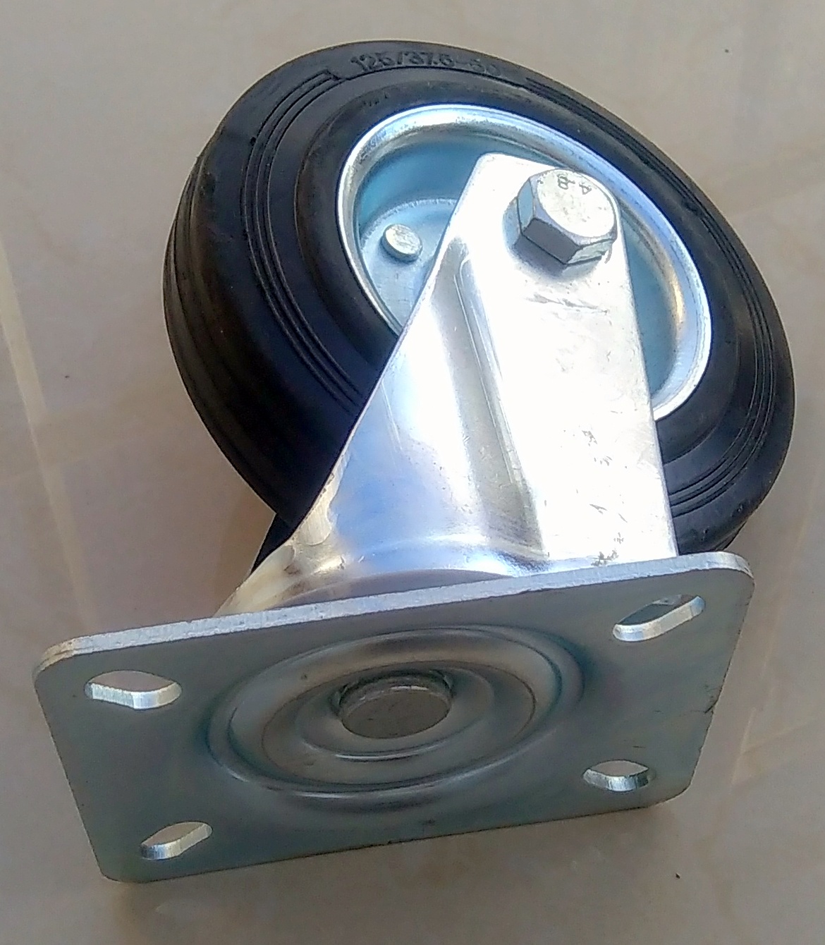 Поворотні колеса встановлені на т.зв. Пластина являє собою комбінацію вилки з пресованого сталевого листа і колеса зі сталевою втулкою і шиною з суцільної чорної гуми. Поворотна головка вилки має подвійні підшипники і захищена від бруду спеціальним пиловим ущільнювачем. Всі металеві елементи комплекту покриті антикорозійним хромоцинковим покриттям.