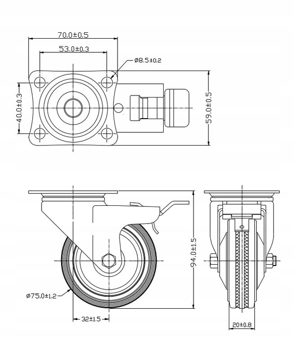 ПОВОРОТНЕ КОЛЕСО З ГАЛЬМОМ 75 мм МЕТАЛ І ГУМА ДЛЯ ТРАНСПОРТНОГО ВОЗКА