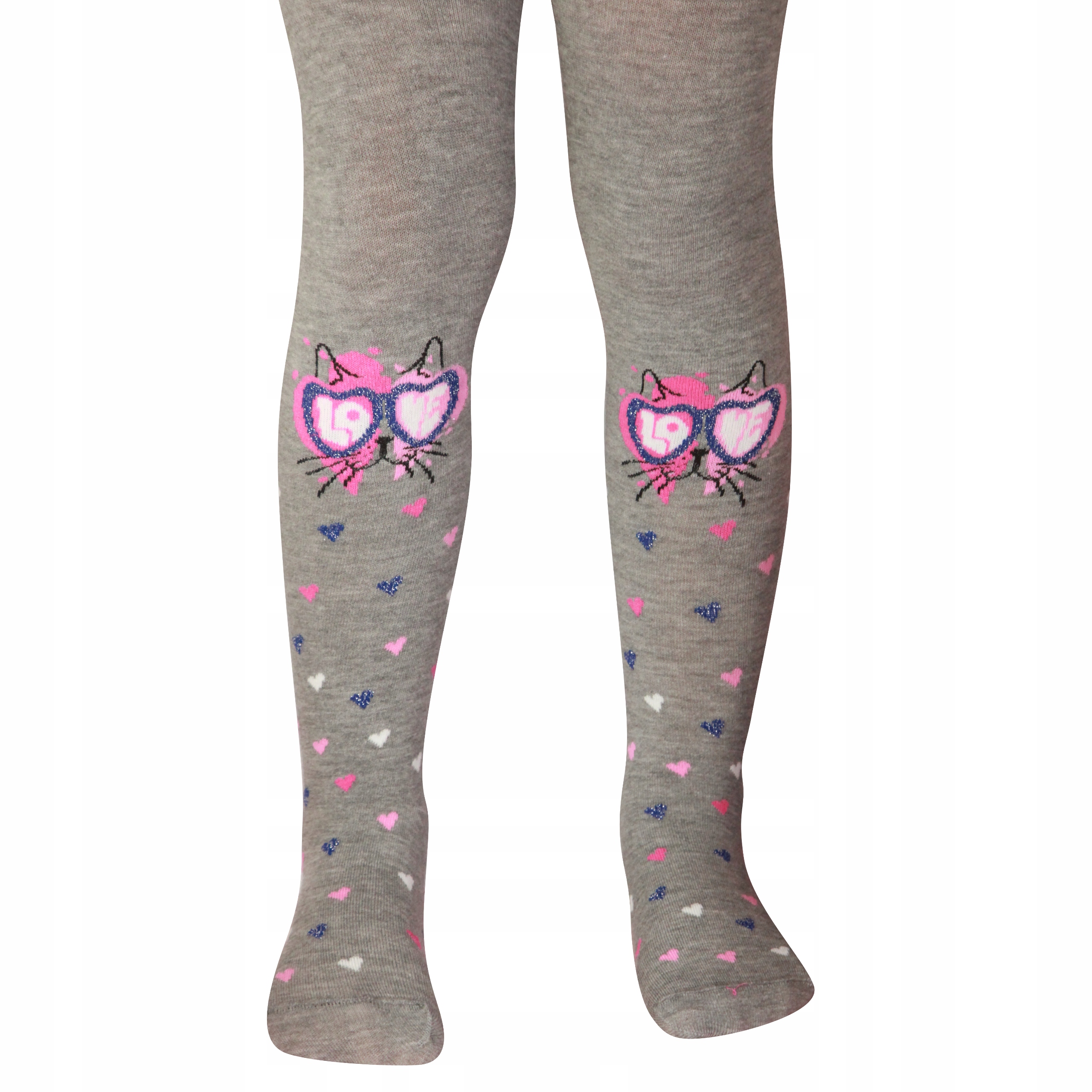 Сірі колготки з мотивом веселого кота в окулярах і сердечках.