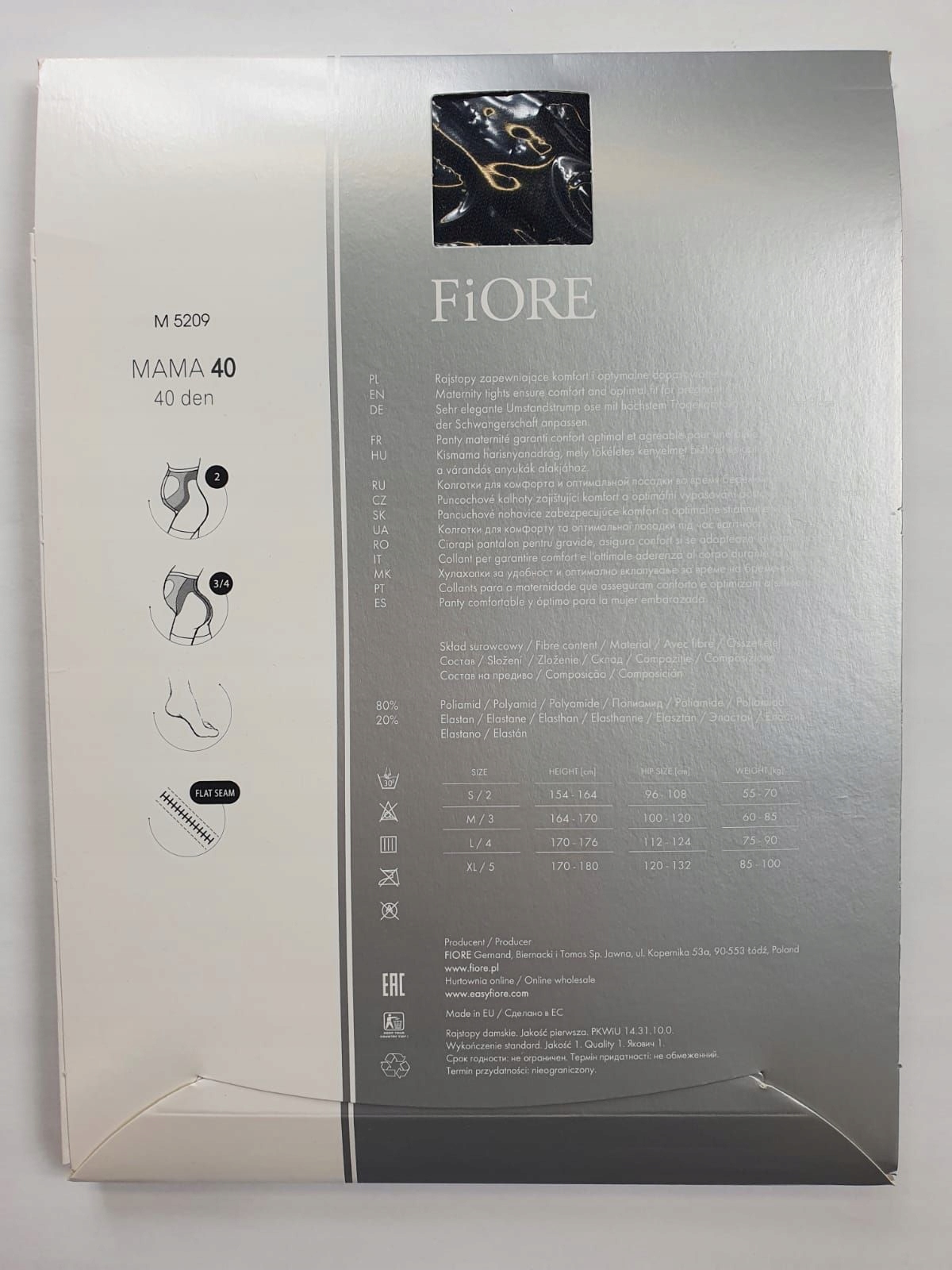 Колготки для вагітних. Непрозорий, матовий, виготовлений з м'якої та приємної на дотик мікрофібри. Вони підтримують живіт і розвантажують хребет, приносячи полегшення. Завдяки використанню технології Silver Fresh шкіра залишається сухою та свіжою. Колготки мають непомітно посилений носок, прошитий плоским швом. Вони забезпечують комфорт і оптимальне прилягання до тіла під час вагітності. Товщина: 40 ден. Склад: 80% поліамід, 20% еластан.