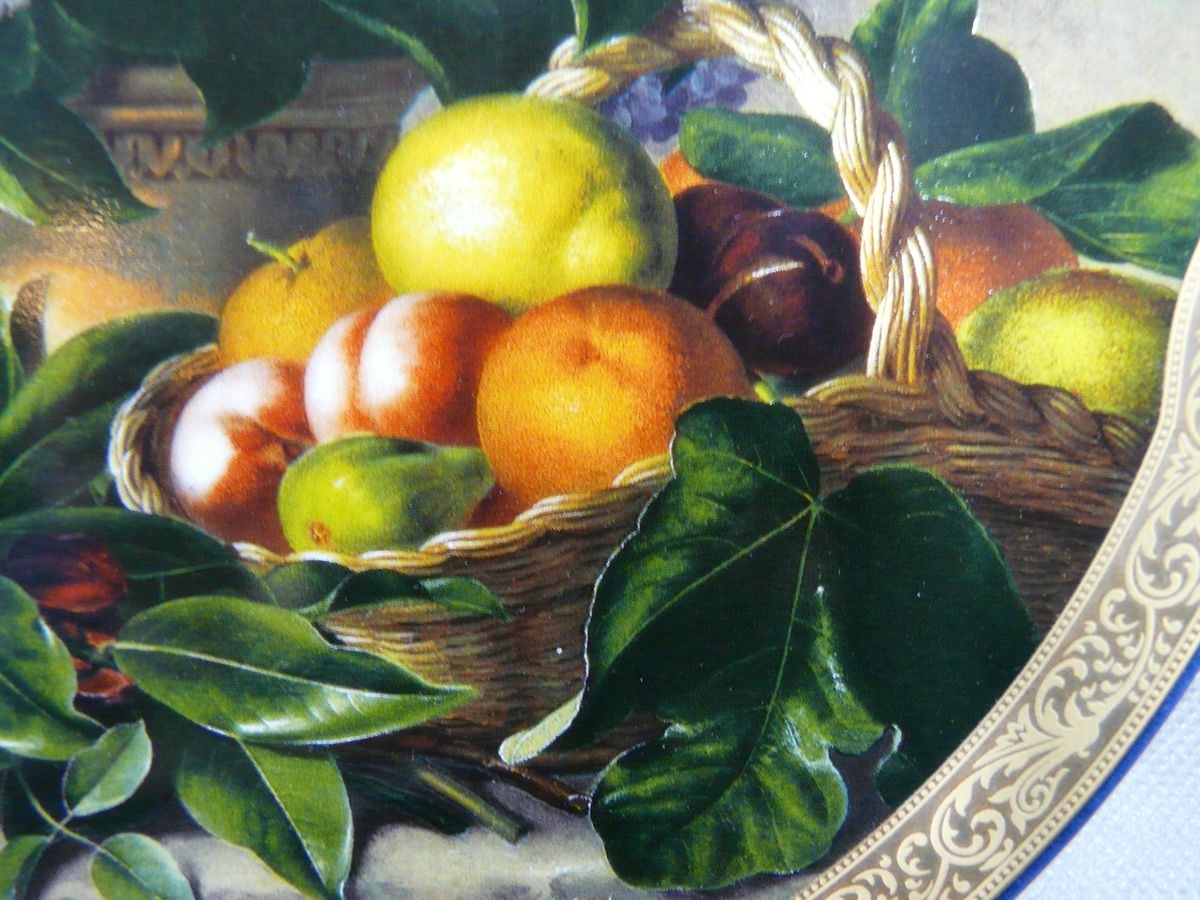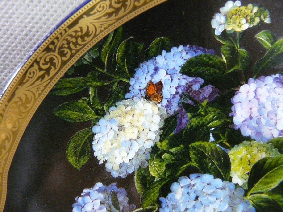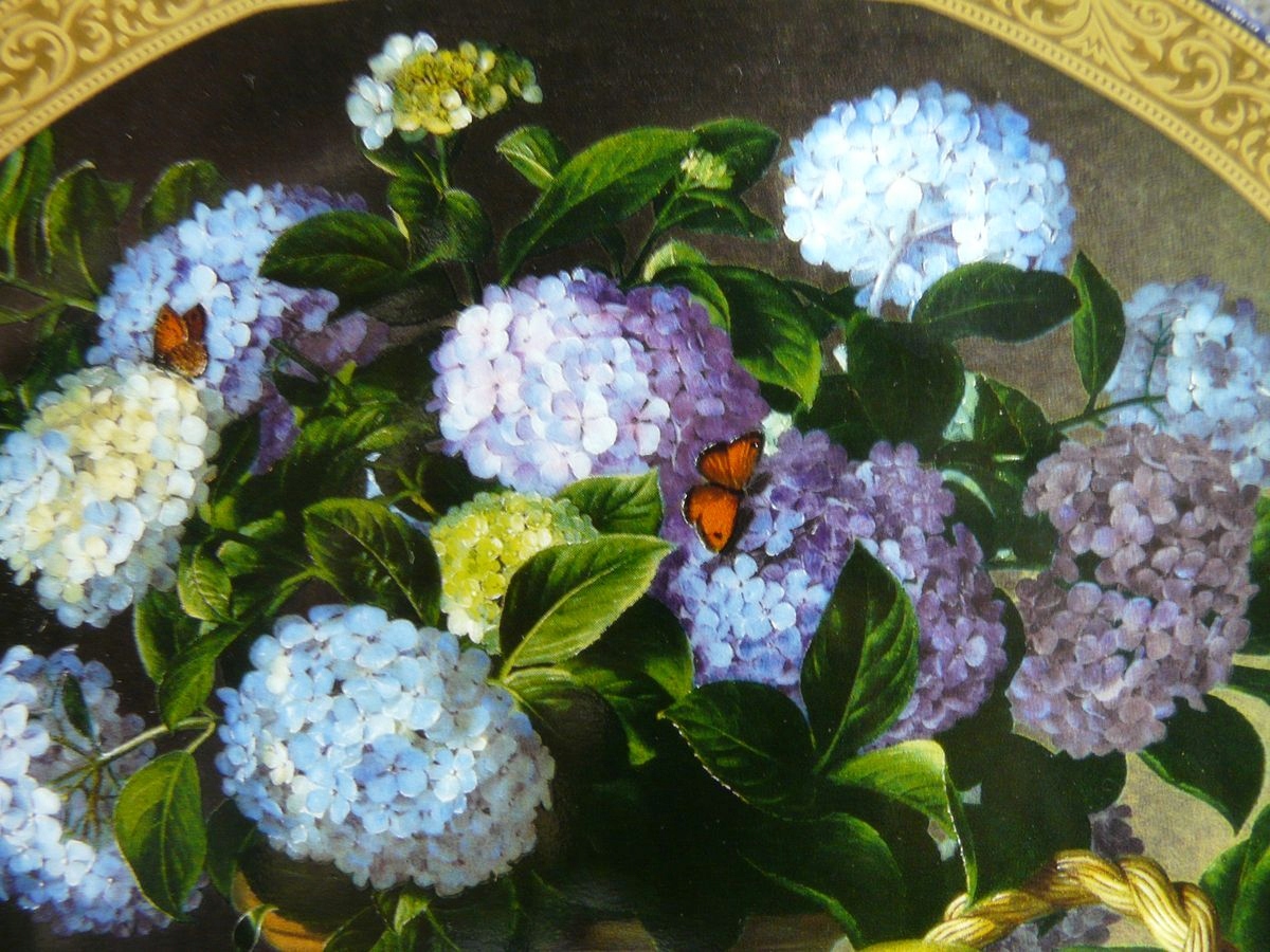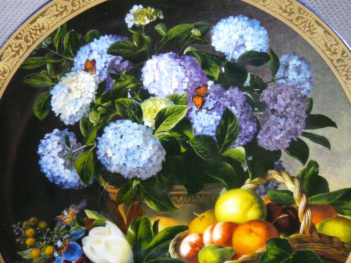 "Hydrangeas with a basket of fruit"