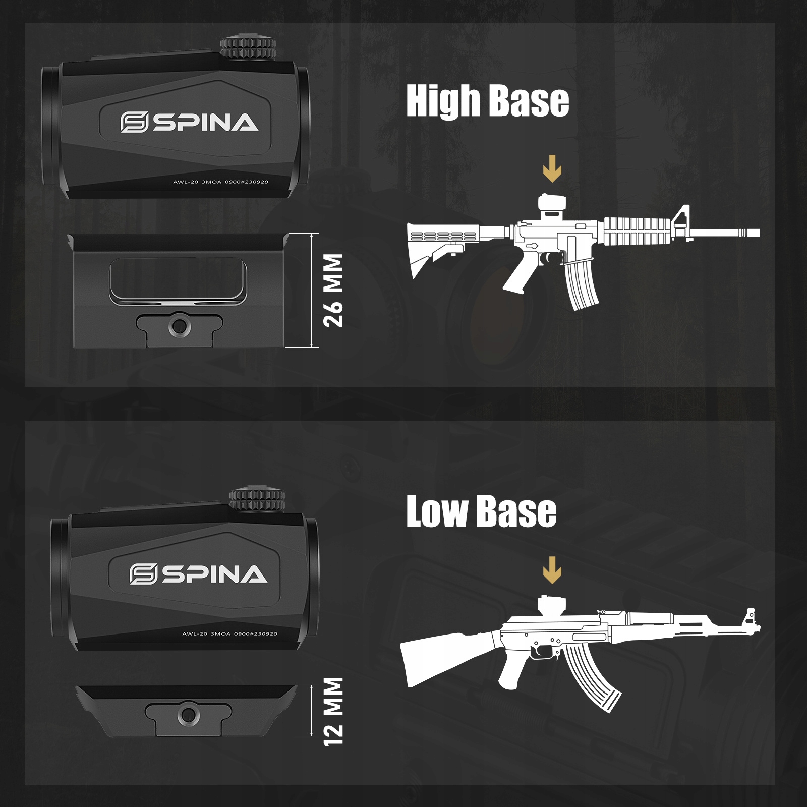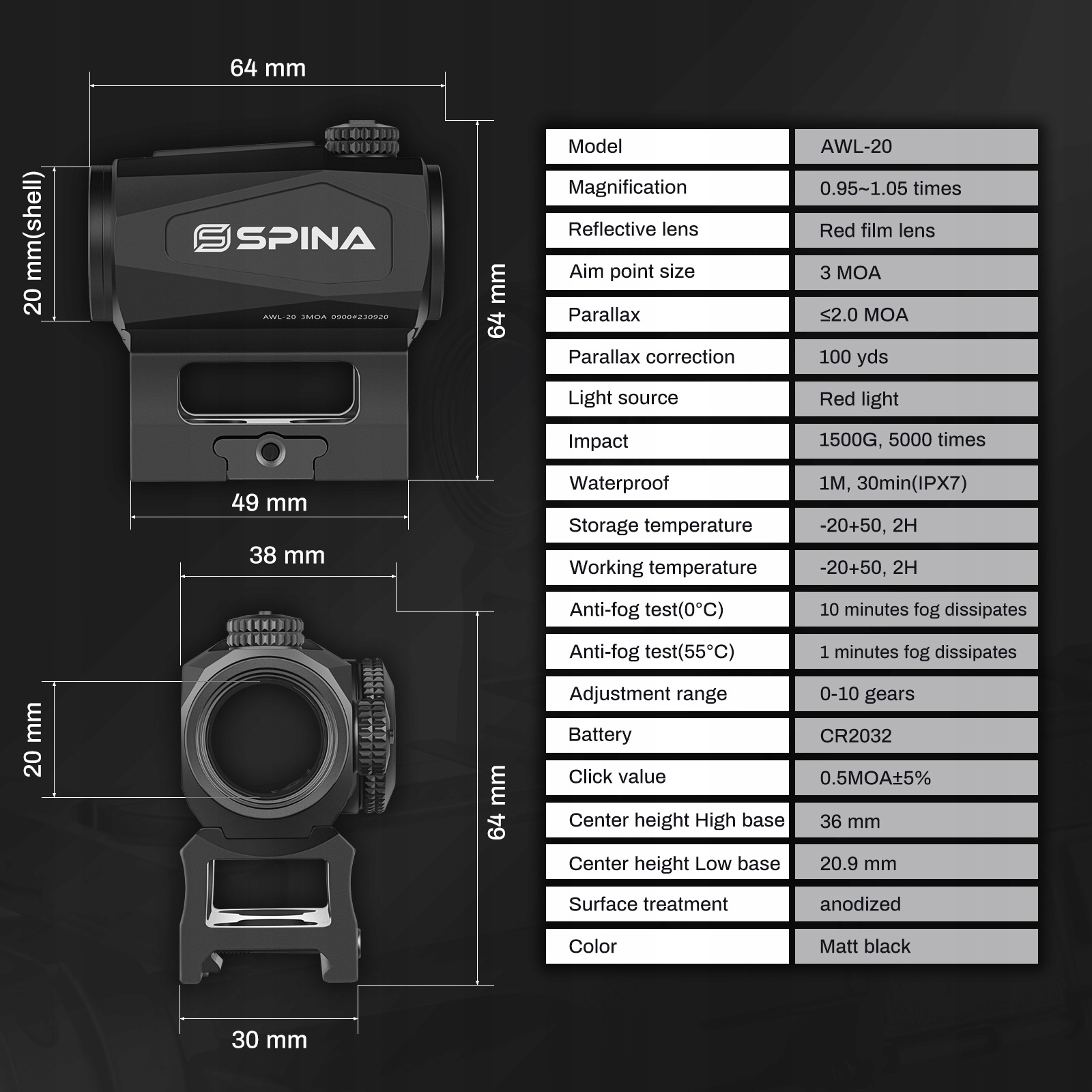 Spina AWL-20-це компактний коліматор з 3-MOA точковим прицілом, ідеально підходить для точної націлювання на короткі та середні відстані. Завдяки функції автоматичної активації ("Shake Way") пристрій вмикається автоматично при виявленні руху, що дозволяє швидко та ефективно працювати. Оснащений 10 рівнем регулювання яскравості, це дозволяє відрегулювати приціл до переважаючих умов освітлення.