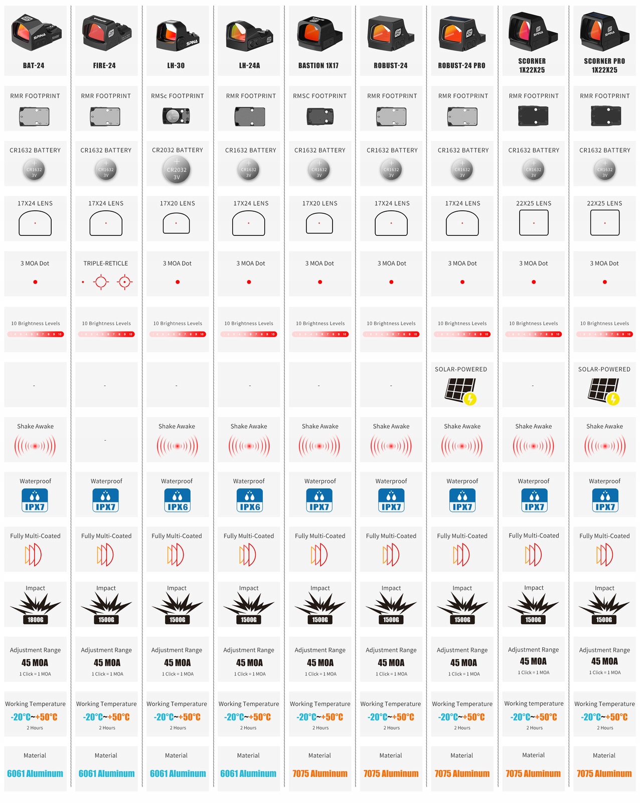 Коліматор SPINA BAT-24 — це вдосконалений оптичний приціл, який забезпечує точність і надійність за будь-яких умов. Оснащена точкою прицілювання 3 MOA та лінзами з антибліковим покриттям Red Film, ця модель гарантує швидке та точне захоплення цілі. Завдяки вбудованому мікроперемикачу і функції Shake Awake пристрій автоматично включається після мінімального руху, економлячи енергію. Можливість регулювати інтенсивність підсвічування (8 денних рівнів і 2 для режиму нічного бачення) робить його універсальним інструментом для використання як вдень, так і вночі. BAT-24 є водонепроникним (IPX7), витримує удари до 1800G, а час його роботи становить до 50 000 годин від однієї батареї CR1632.