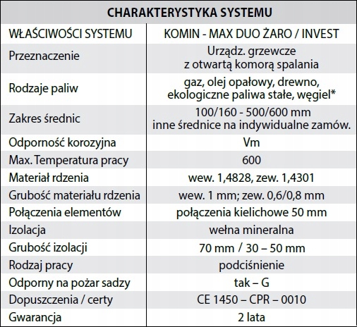 Двостінні димохідні системи типу KOMIN-MAX DUO ŻAROз внутрішньою оболонкою з жароміцного листового металу призначені для відведення відпрацьованих газів від пристроїв, що працюють на дровах, газі, мазуті. та екологічне тверде паливо, як окремо стоячі димоходи. p>