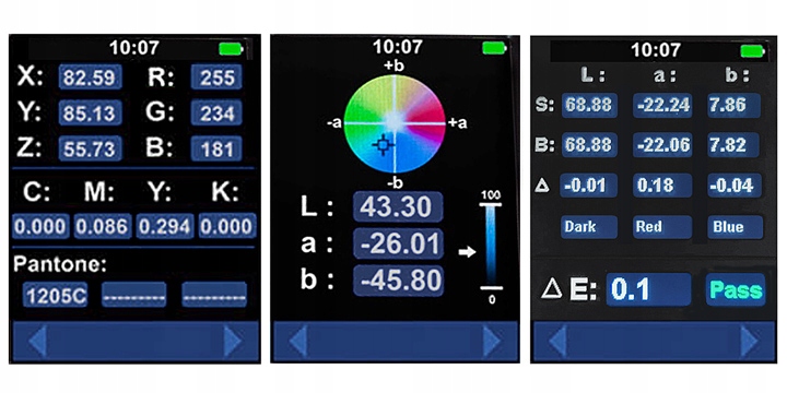 Пристрій має освітлений, кольоровий дисплей, на якому результати представлені в різних стандартах. Крім того, колориметр може визначити різницю кольору (Delta E) між двома зразками, що дозволяє ефективно проводити порівняльний аналіз: