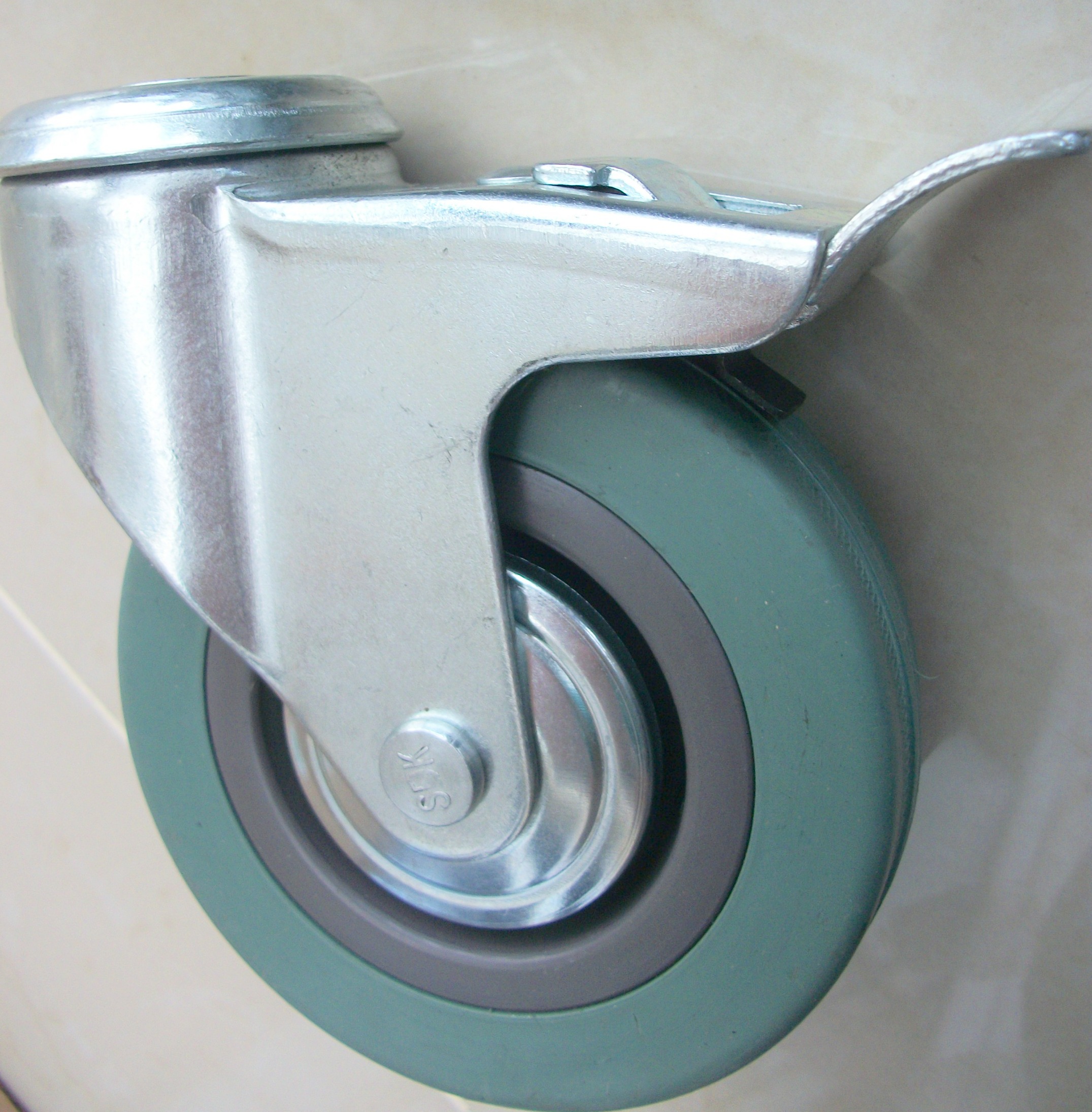 Колеса, встановлені на отворі, являють собою комбінацію вилки апарату з пресованого сталевого листа та колеса з поліпропіленовою втулкою та шиною з сірої немаркої гуми. Поворотна головка вилки має подвійні підшипники. Всі металеві елементи комплекту покриті антикорозійним хромоцинковим покриттям. Гальмо блокує колесо та голову.