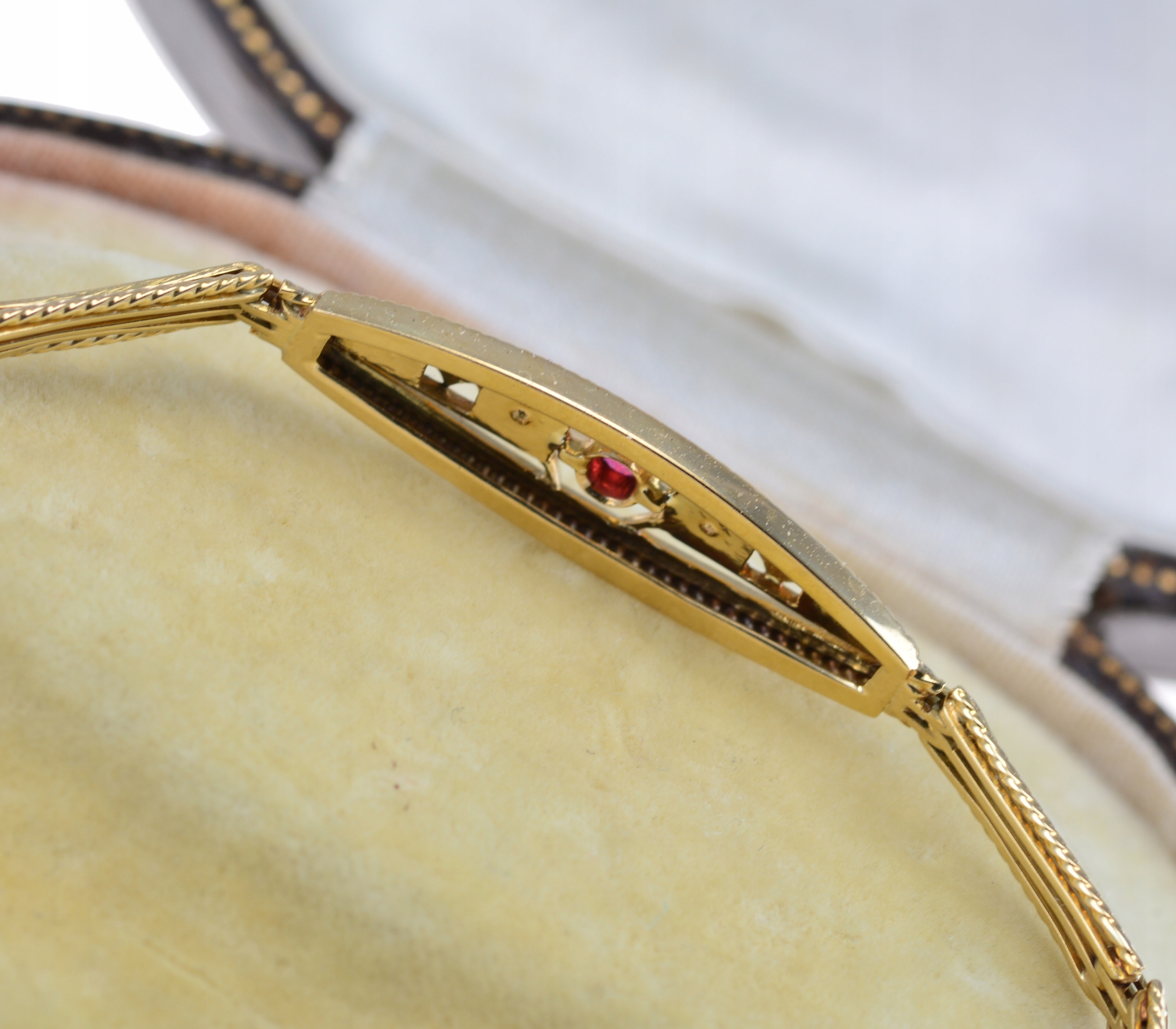 Тема продажу - колишній золотий браслет, прикрашений перлами та рожевим склянкою око. Судячи з того, як браслет був зроблений у першій половині 20 століття. Функціональне кріплення коробки. Декоративна коробка в наборі.